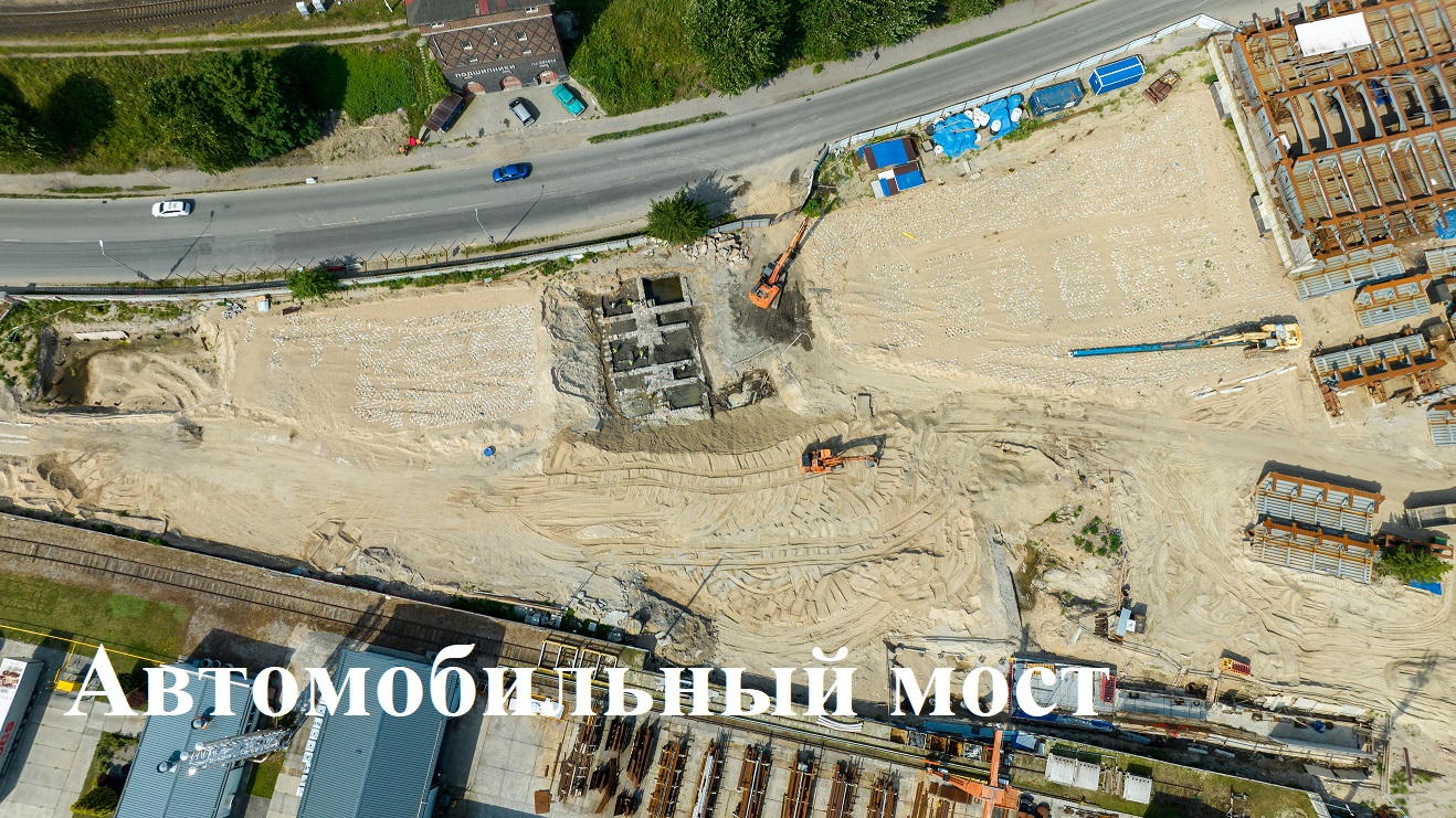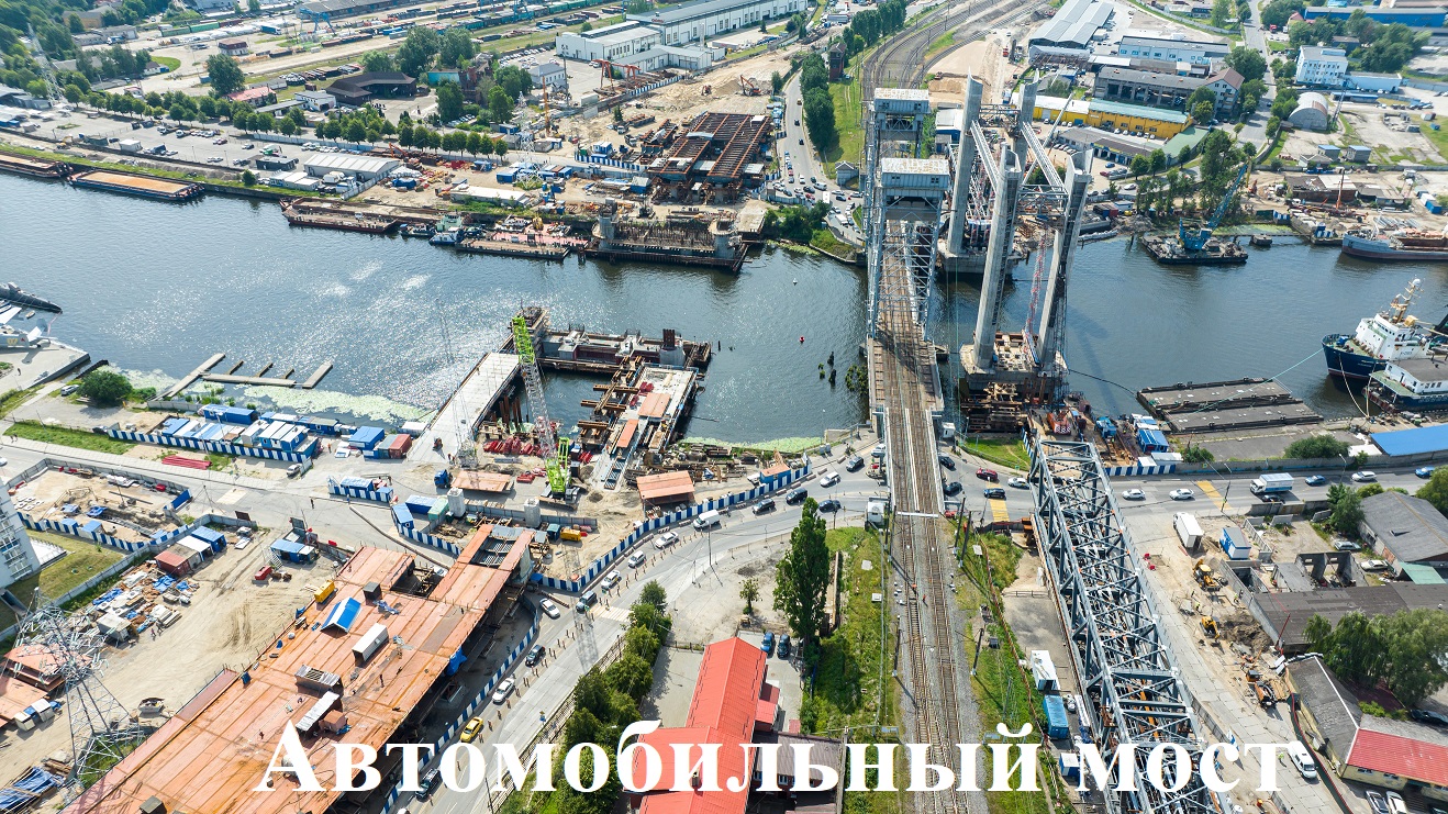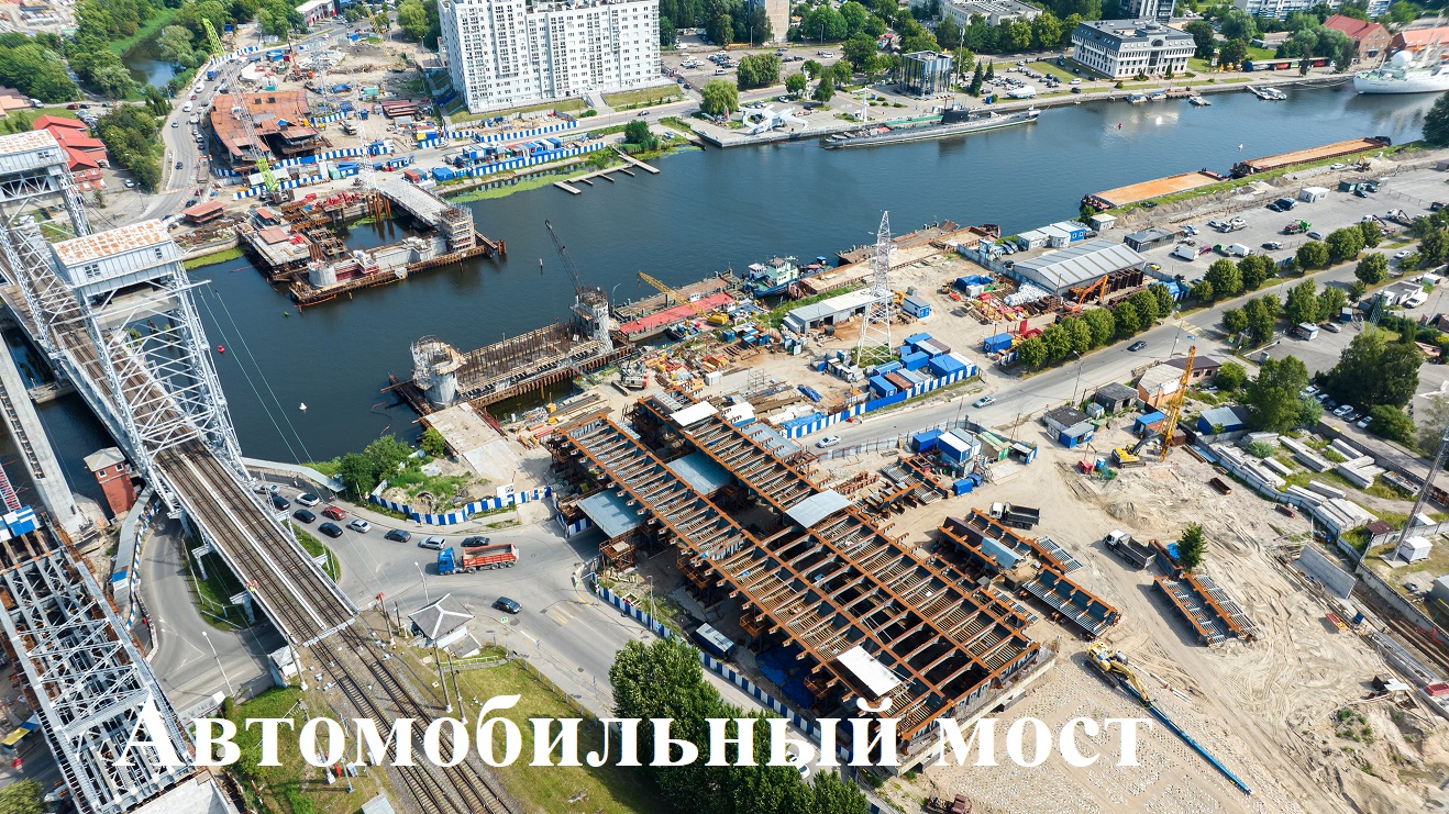 На подходах к будущему автомобильному мосту через Преголю ведут работы по переустройству теплосетей, канализации, газопровода, силовых кабелей на обоих берегах Преголи и прилегающих улицах, армирование опор и башен, установку опалубок, сооружение подпорных стенок, наращивают проценты выполнения по графику сборки ортотропных плит на стапелях, металлоконструкций пролётных строений, усиления грунтов, устройства вертикальных ленточных дрен.
