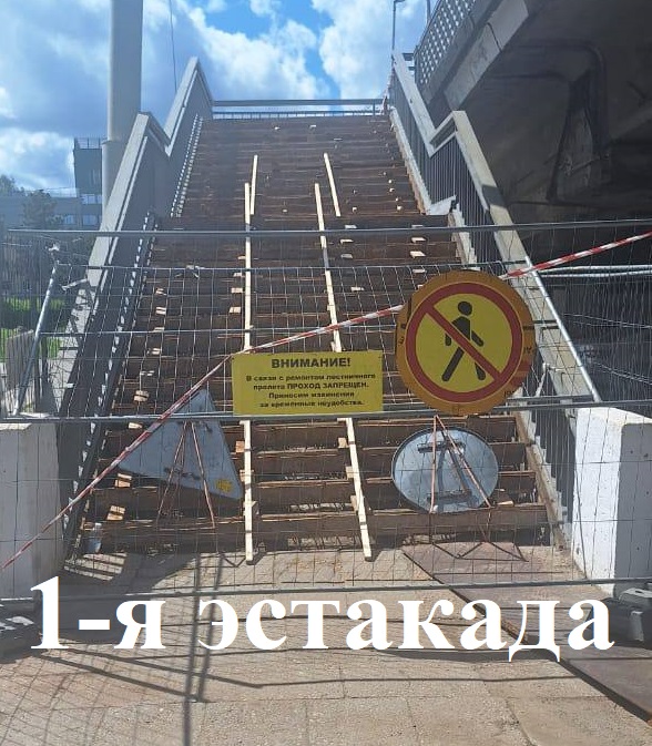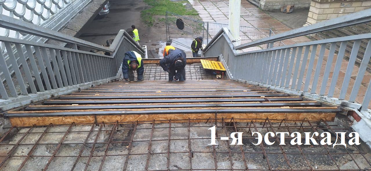 Ремонт лестничного спуска с 1-й эстакады продолжался на этой неделе. Мостовики смонтировали арматуру и каркас, подготовили ступени к заливке бетоном.