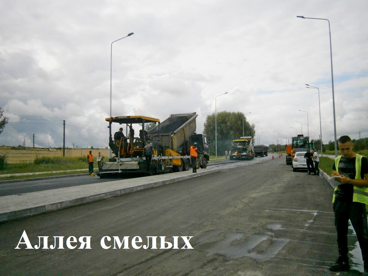 На Аллее Смелых уложили тактильную плитку, в пятницу начали укладку верхнего слоя асфальтобетонного покрытия.
