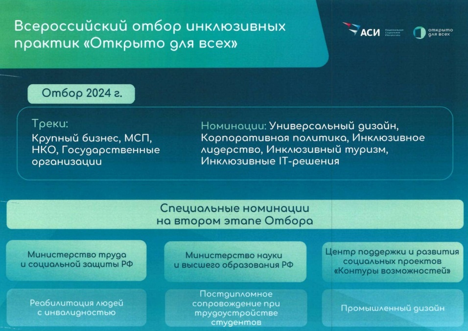 Автономной некоммерческой организацией «Агентство стратегических инициатив по продвижению новых проектов» с 2022 года в рамках Национальной социальной инициативы реализуется инклюзивный проект «Открыто для всех», направленный на вовлечение бизнеса в создание доступной среды, услуг и сервисов для людей с инвалидностью и ограниченными возможностями здоровья, поиск и тиражирование новых технологий в инклюзии.