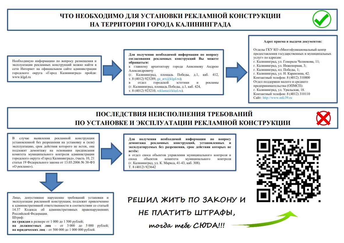 Более подробная информация по вопросам установки рекламной конструкции на законных основаниях на территории города Калининграда находится на сайте администрации Калининграда