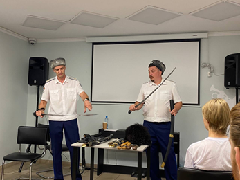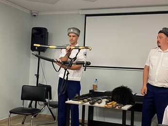 Представители общественной организации продемонстрировали традиционные и современные атрибуты казачьего облачения и вооружения, а также ответили на различные вопросы подростков, в том числе об особенностях казачьей службы.