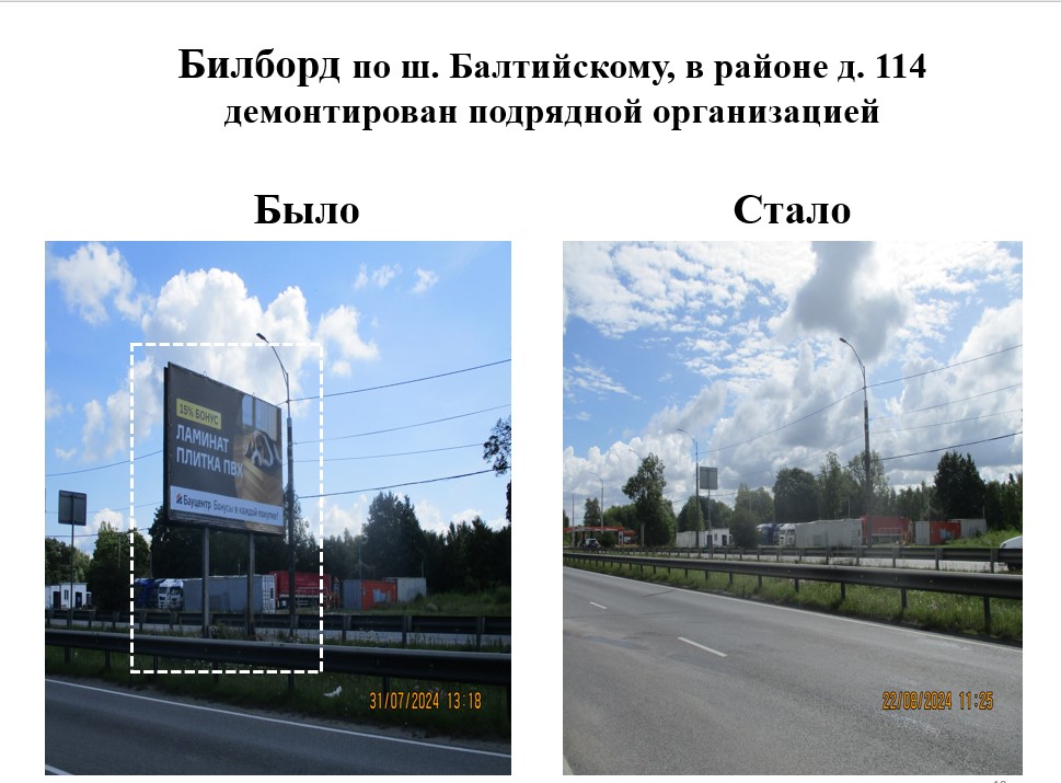 Если рекламную конструкцию установили без разрешения, она подлежит демонтажу. Так, в сентябре 2024 года, в связи с неисполнением предписаний, демонтировали рекламную конструкцию – билборд в районе дома 114 на Балтийском шоссе.