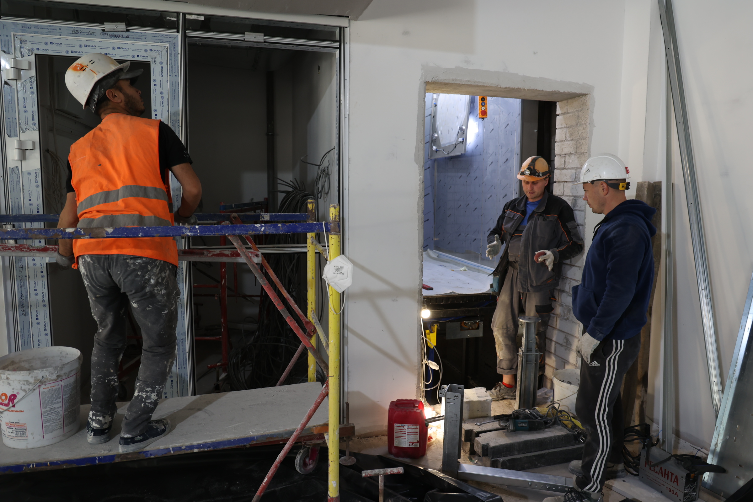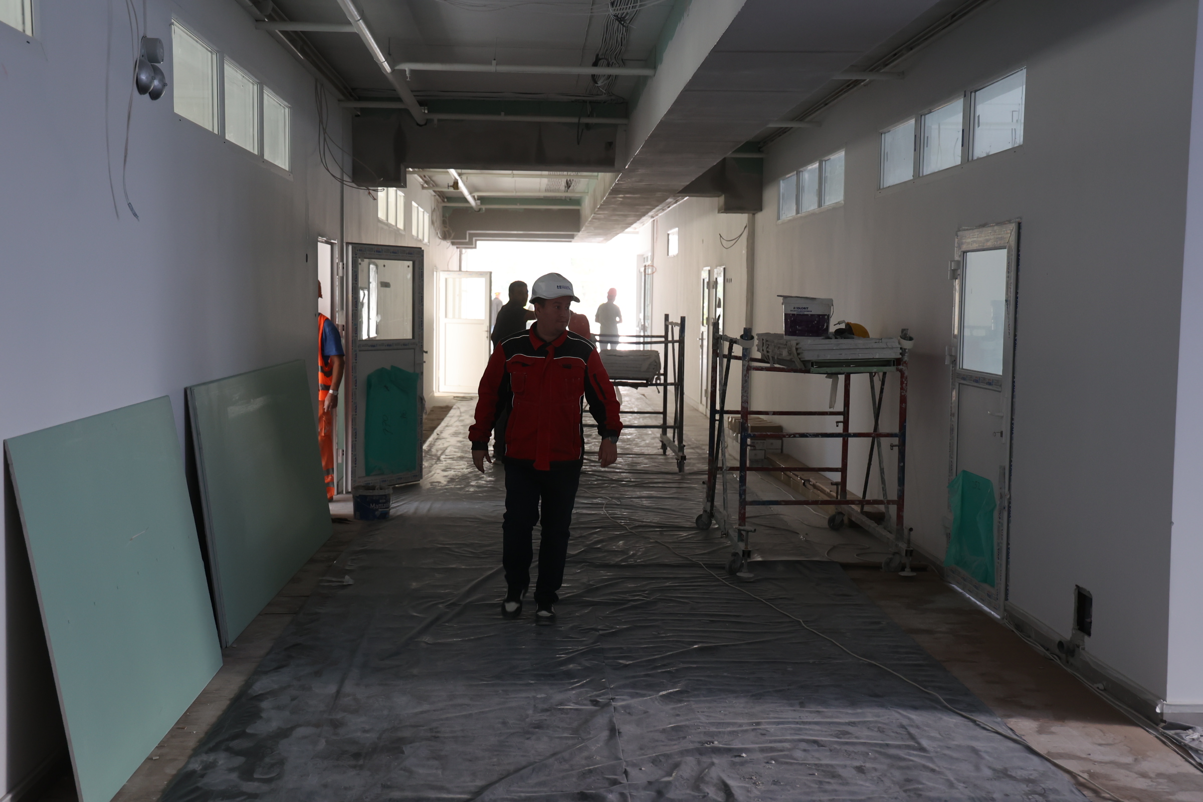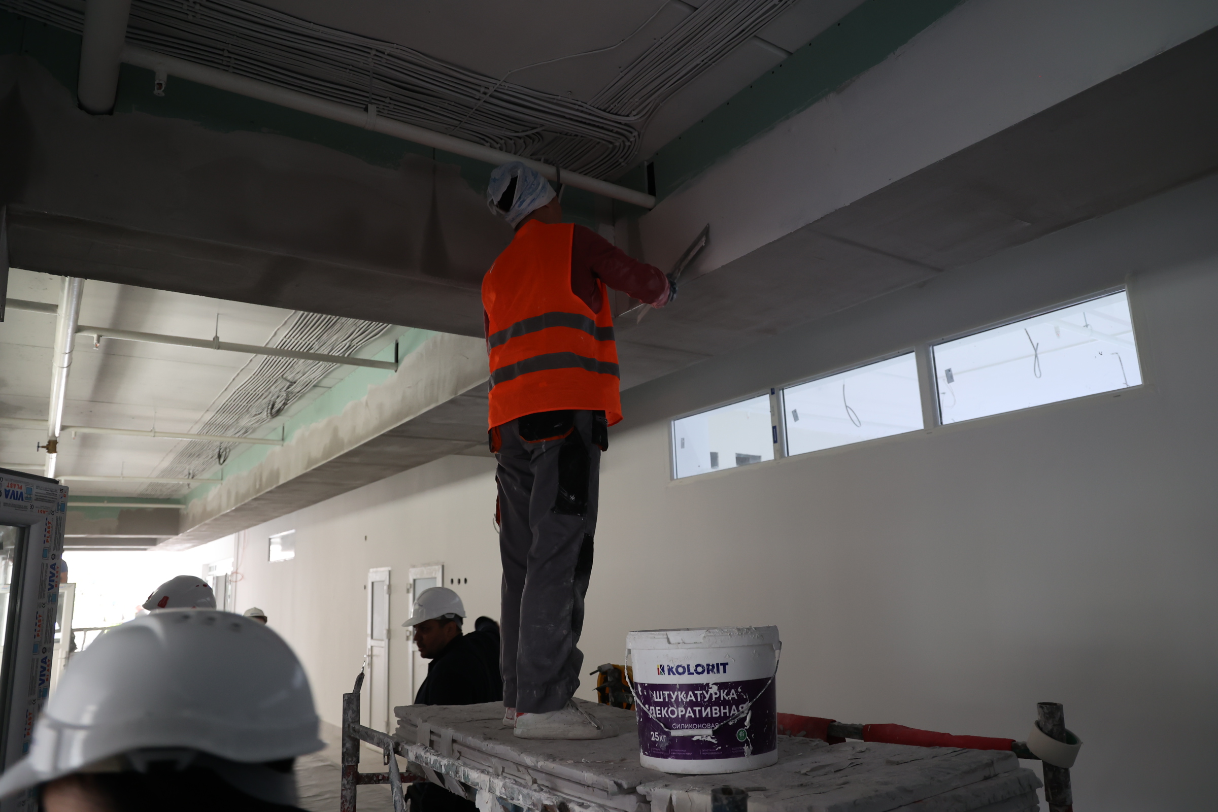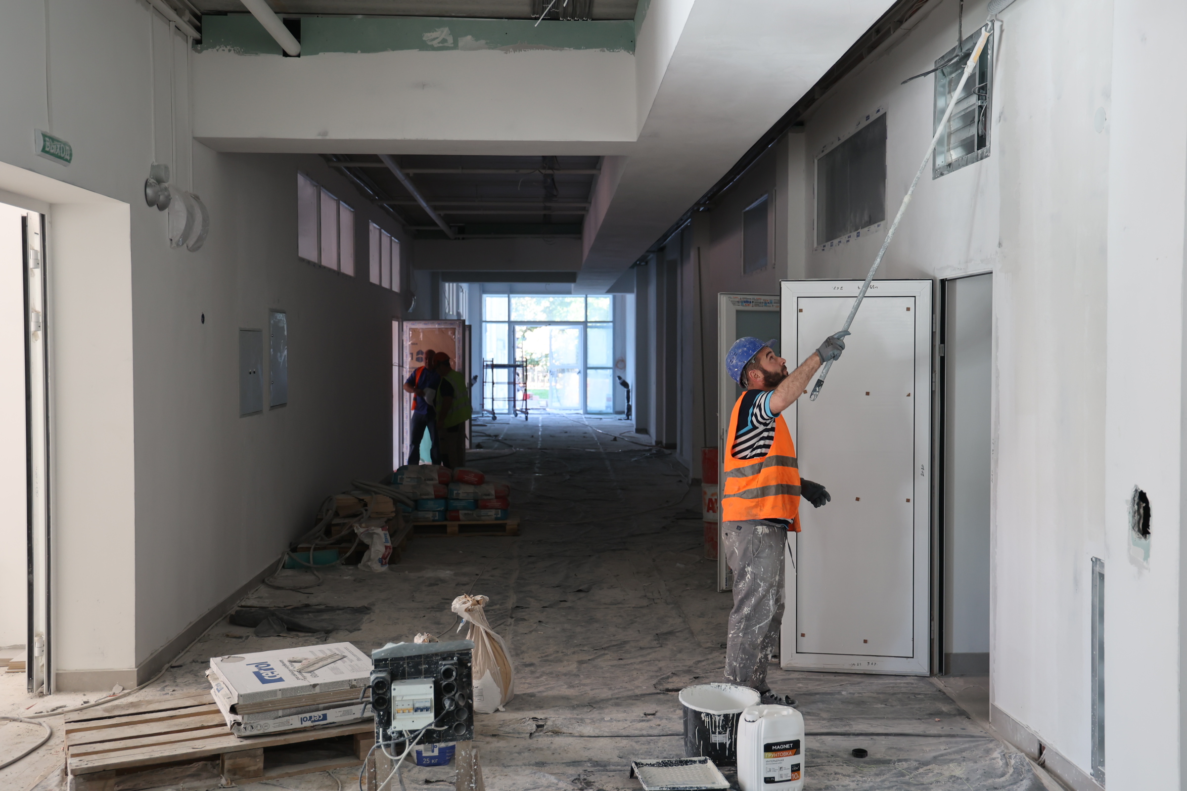 Сейчас на объекте одновременно трудятся 130 человек и несколько единиц техники. Отделочные работы ведутся на всех 5 этажах одновременно, где-то монтируют системы отопления, протягивают электрокабели, пожарную сигнализацию, собирают лифтовое оборудование. По улице тянут свет и канализацию, занимаются благоустройством.