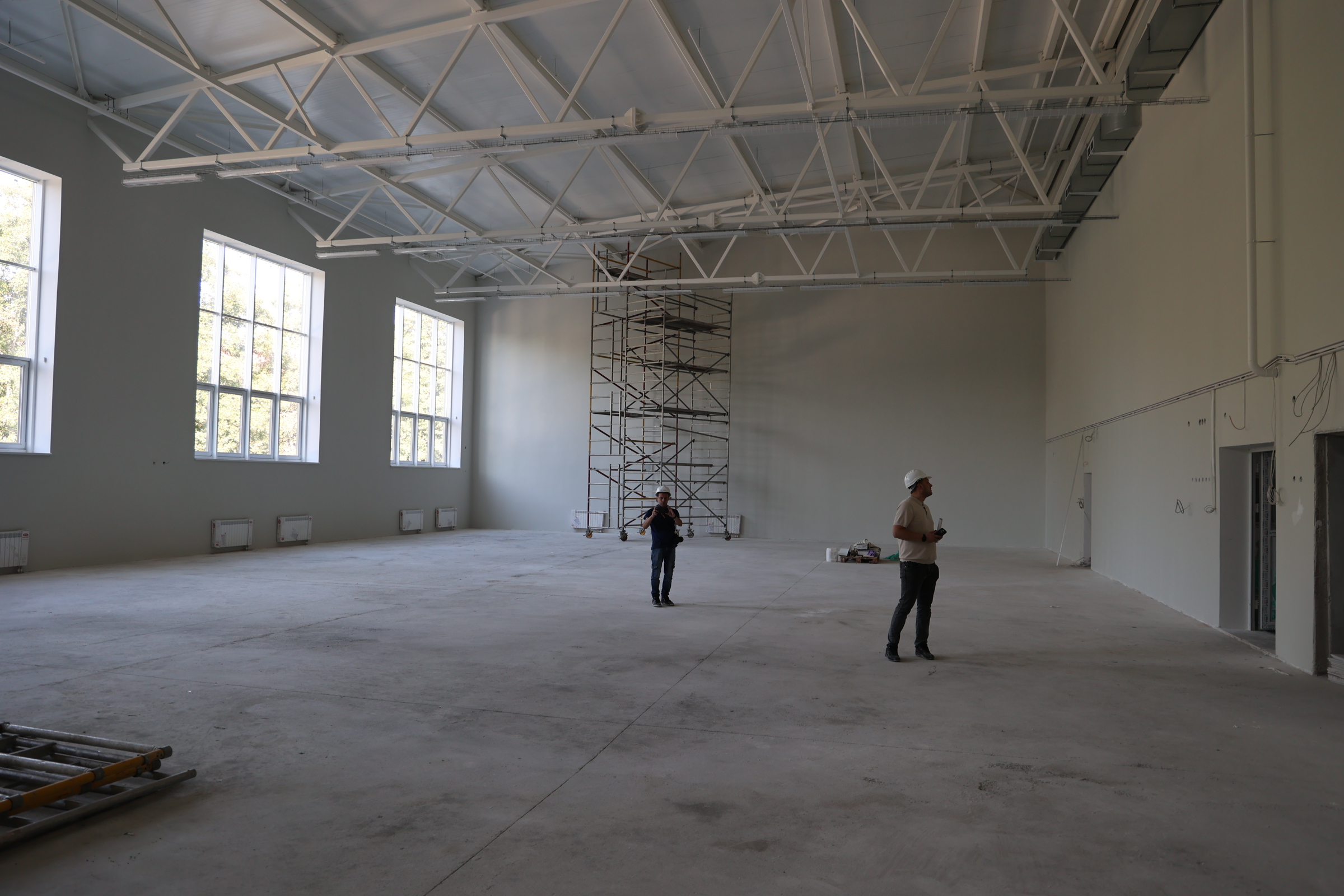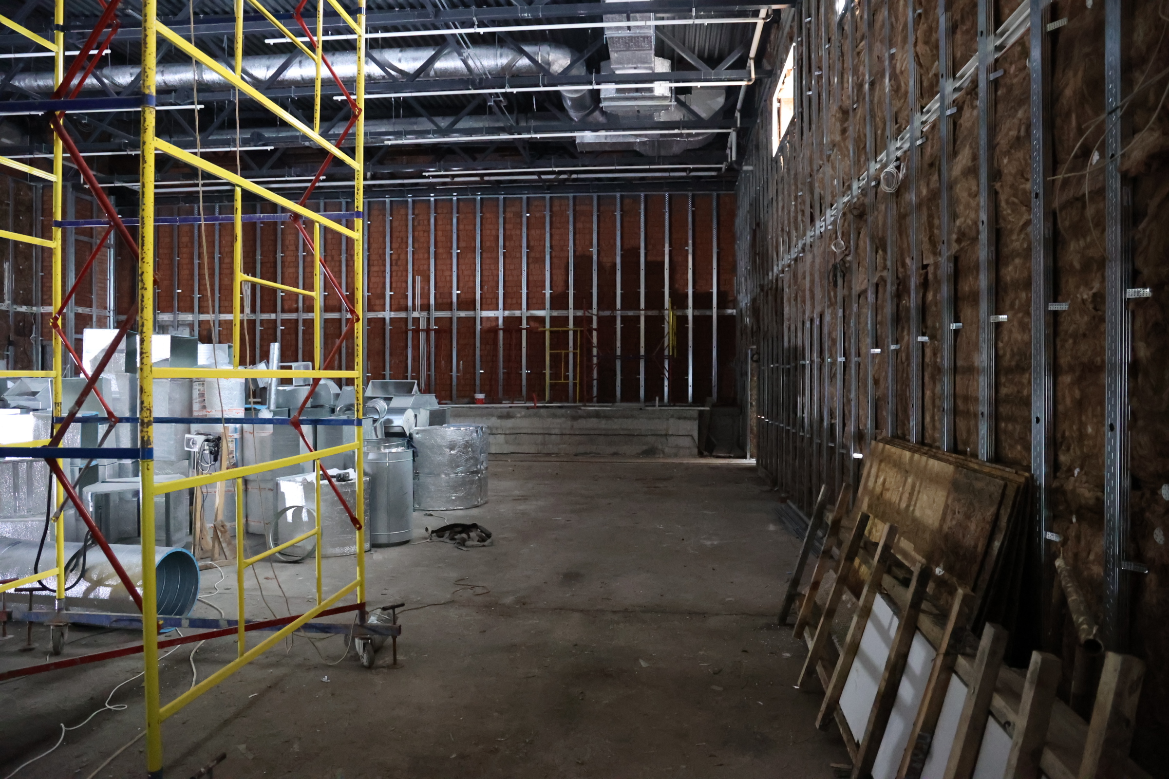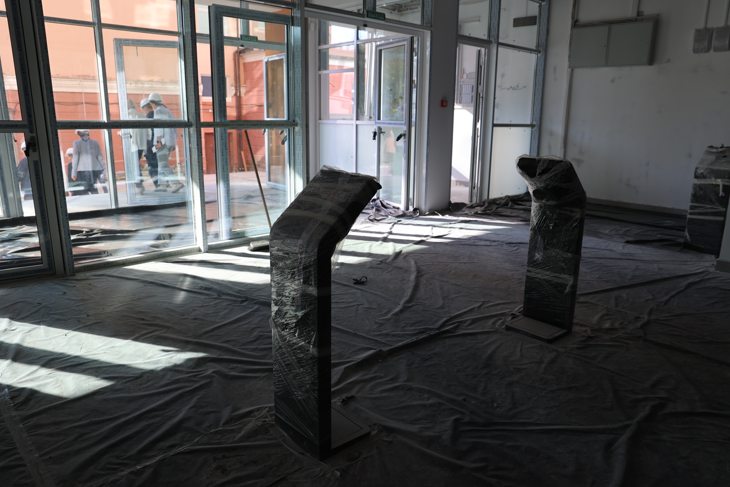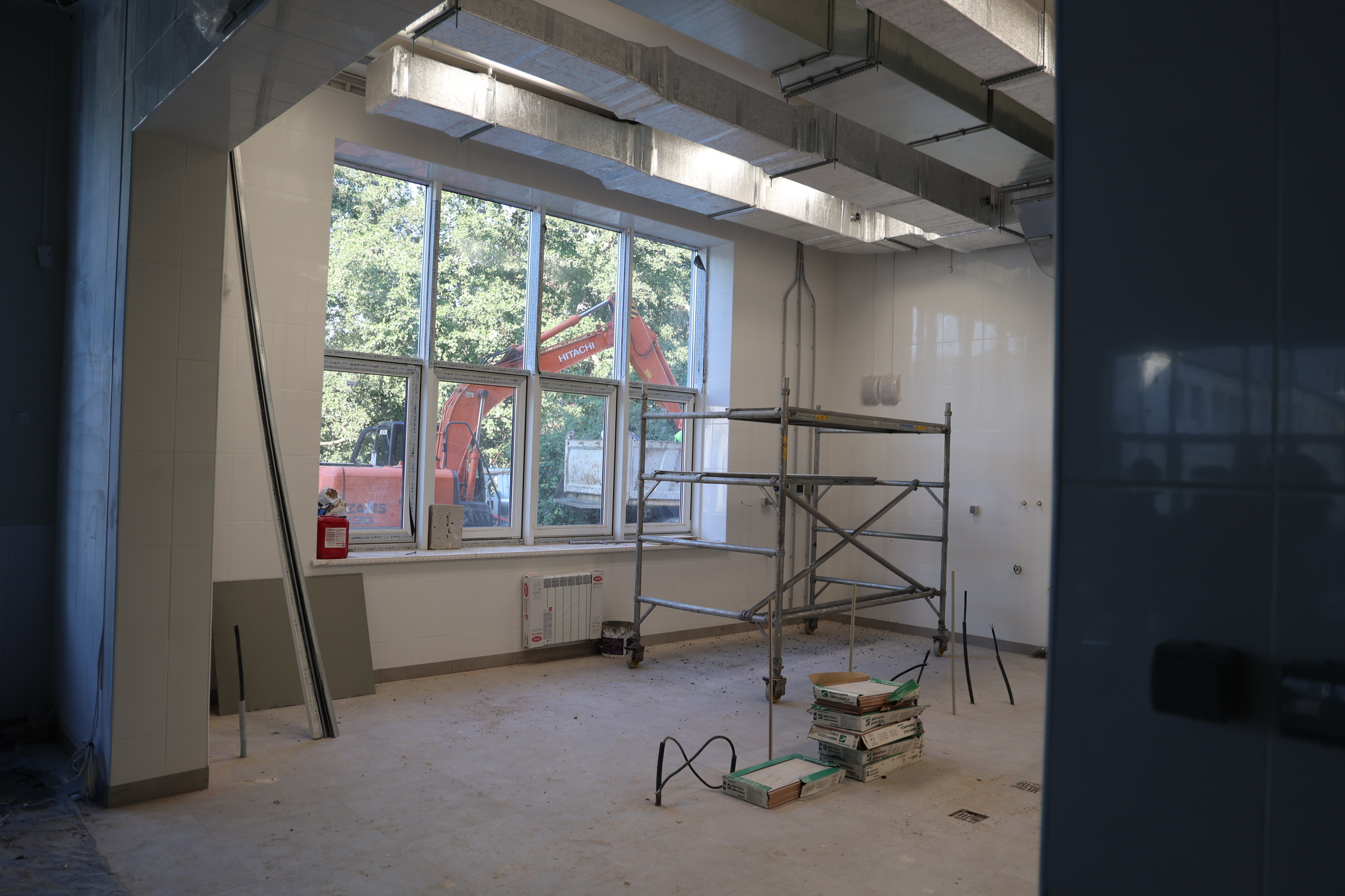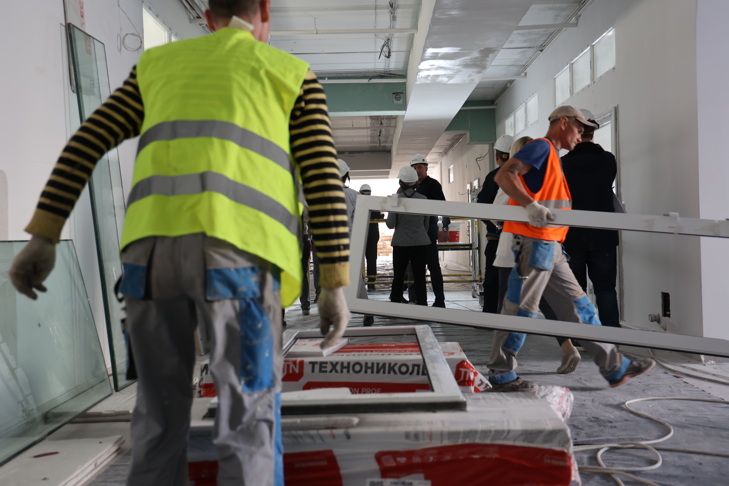 Сейчас на объекте одновременно трудятся 130 человек и несколько единиц техники. Отделочные работы ведутся на всех 5 этажах одновременно, где-то монтируют системы отопления, протягивают электрокабели, пожарную сигнализацию, собирают лифтовое оборудование. По улице тянут свет и канализацию, занимаются благоустройством.
