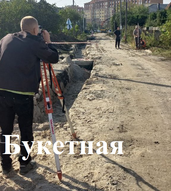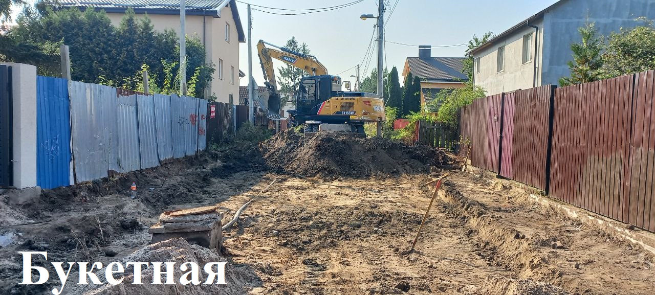 Ул. Букетная: подготовка основания под проезжую часть; устройство сети ливневой канализации; монтаж колодцев ливневой канализации. На Букетной дорожники по сетям, переносу оград за красные линии работают во взаимодействии с местными жителями и ГК КО «Водоканал».