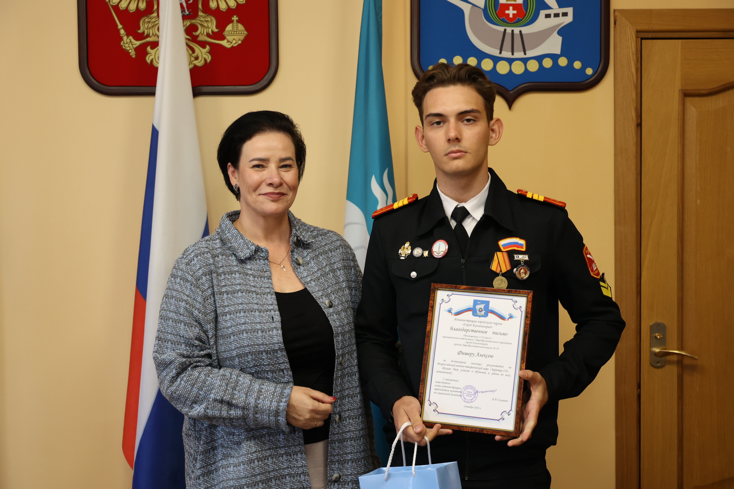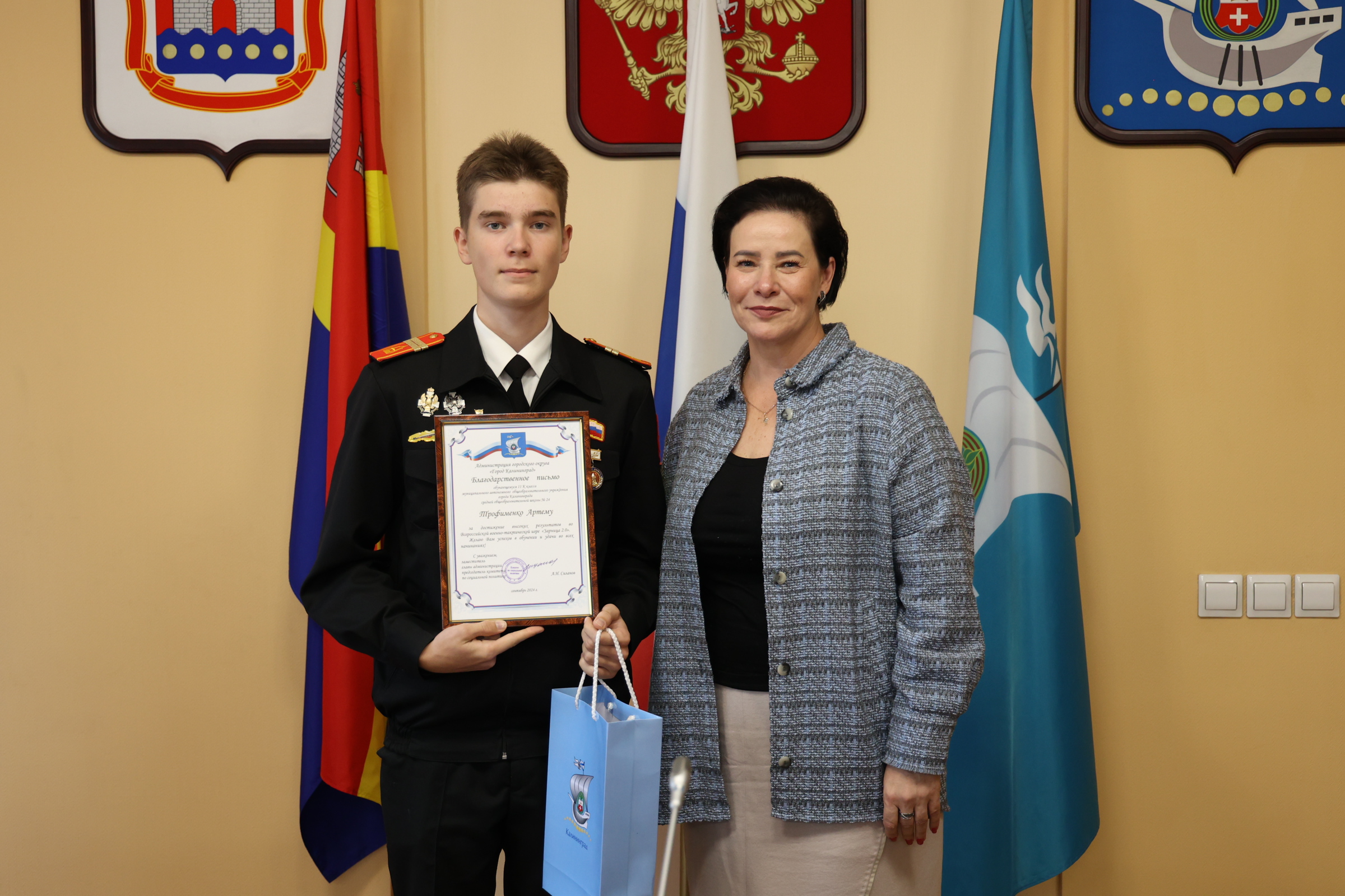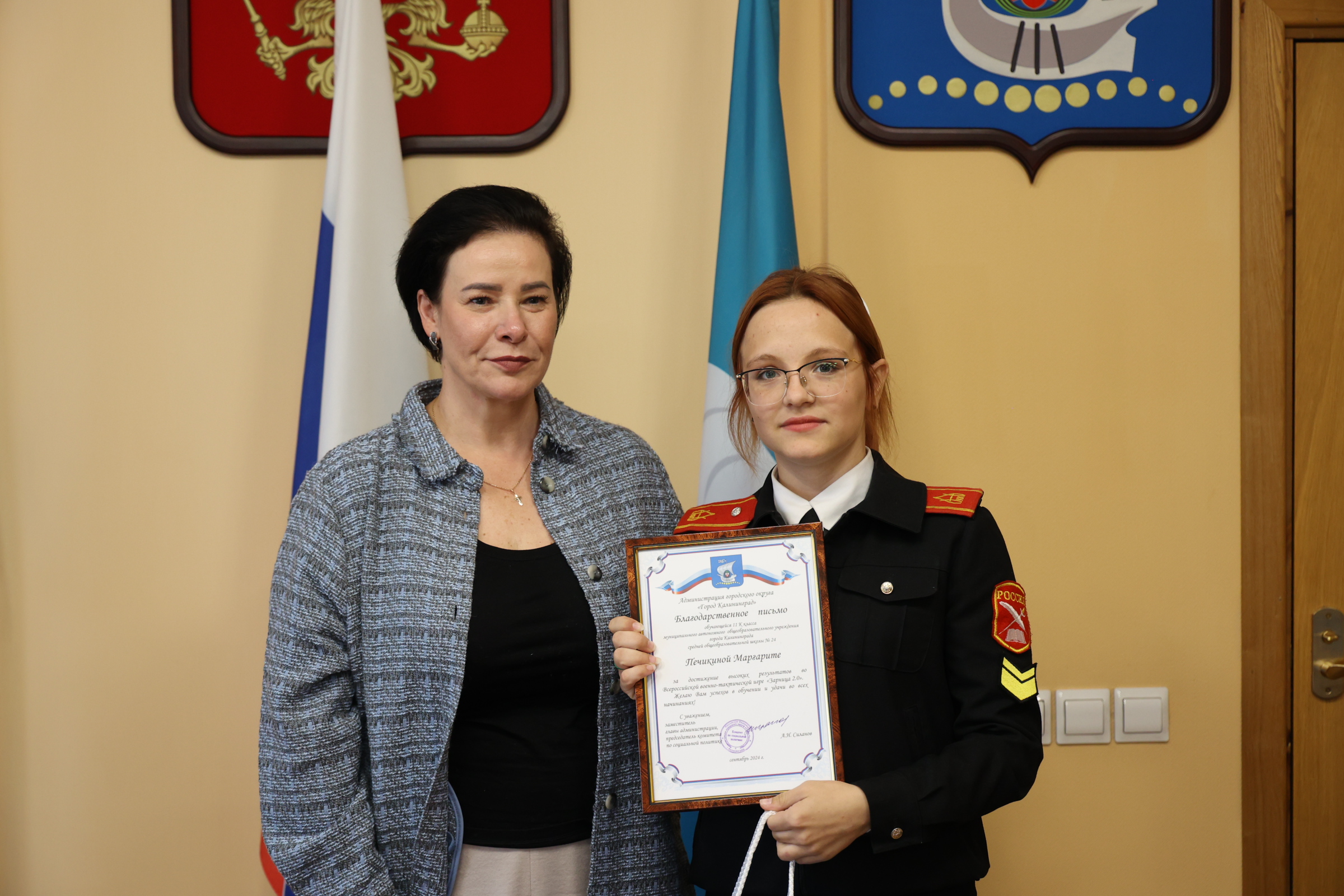 Сегодня в администрации Калининграда чествовали участников Всероссийской военно-патриотической игры «Зарница 2.0» и «Безопасное колесо 2024». Поздравила ребят и их наставников глава областного центра Елена Дятлова.