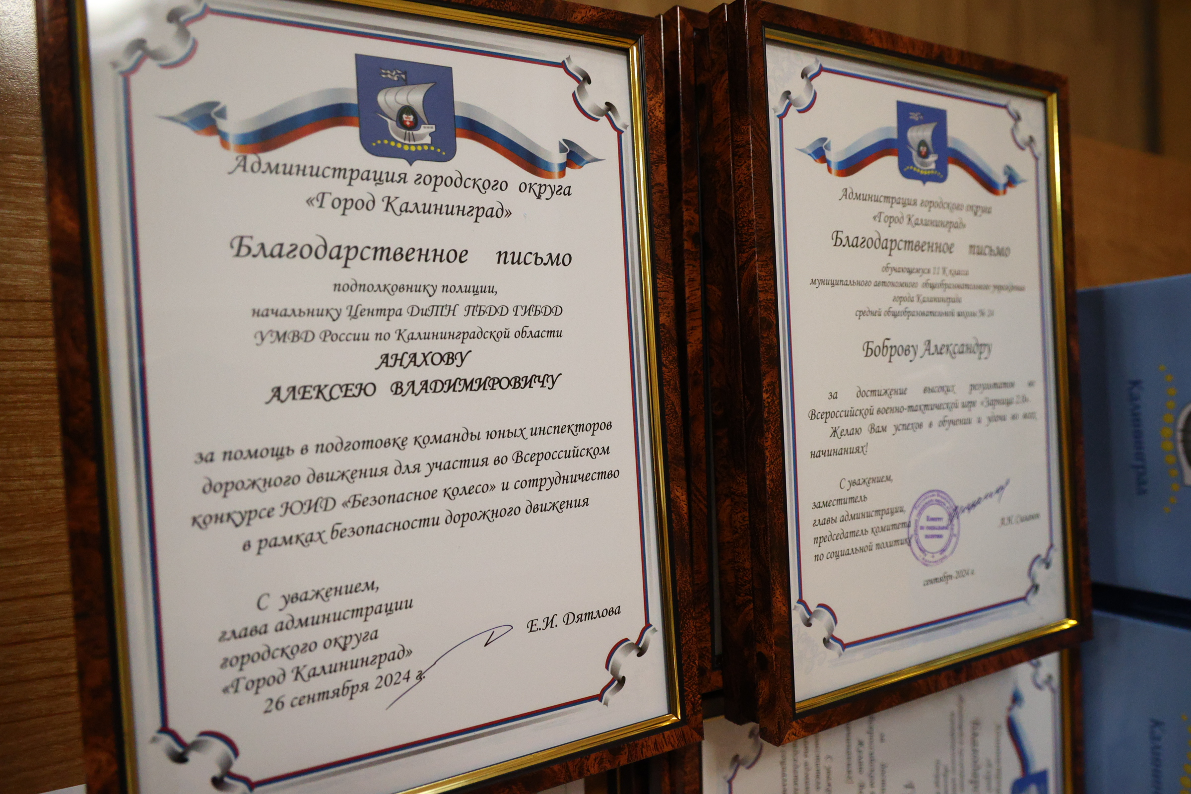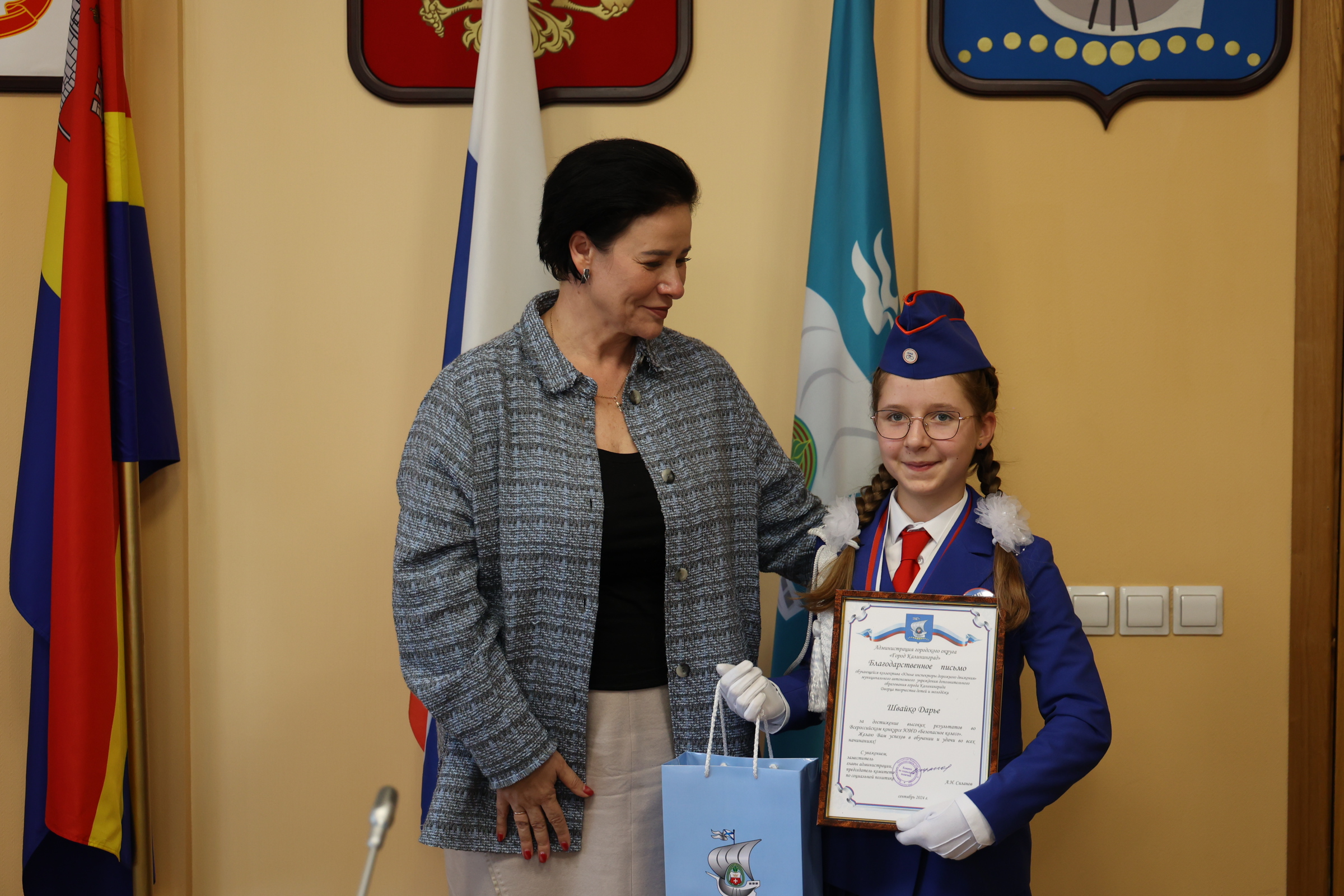 Благодарственные письма и поздравления также получили юные инспекторы дорожного движения. С 1 по 7 сентября в Екатеринбурге состоялся Всероссийский финал конкурса юных инспекторов дорожного движения «Безопасное колесо». Всего в нем принимали участие 86 команд – это представители субъектов Российской Федерации, ставшие победителями региональных этапов. В борьбе за звание лучшей команды участвовали школьники в возрасте от 10 до 12 лет – на протяжении недели они соревновались в знании правил дорожного движения и основ оказания первой помощи, умении ориентироваться в дорожно-транспортной среде, фигурном вождении велосипеда, СИМ. Калининградскую область представляли учащиеся Дворца творчества детей и молодёжи: Швайко Дарья, Граченко Арина, Родионов Роман, Марченко Ярослав под руководством педагога-наставника Ольги Гаврюковой и педагога дополнительного образования Фролович Валентины. В личном зачёте наши ребята попали в десятку лучших юидовцев страны: 5 место из 172 мальчиков занял Роман, 10 место - Ярослав, 4 место из 172 девочек заняла Дарья, 9 место – Арина. По результатам всех конкурсных испытаний наша команда вошла в тройку, заняв третье место на пьедестале.