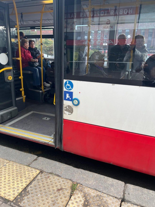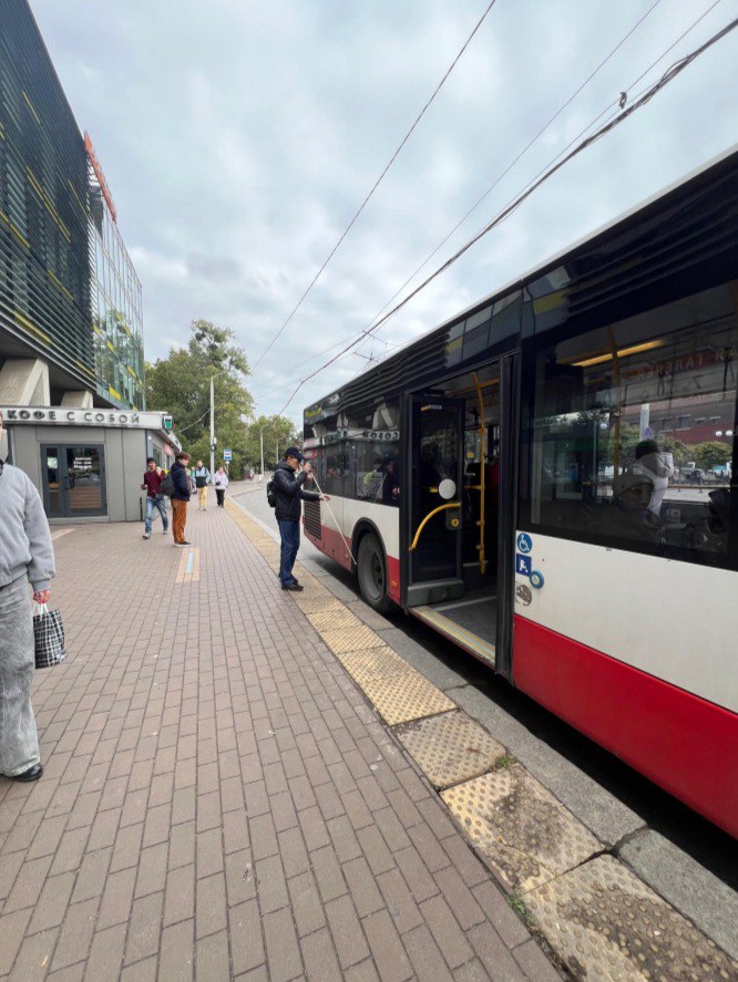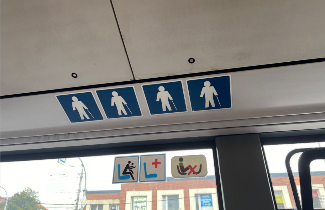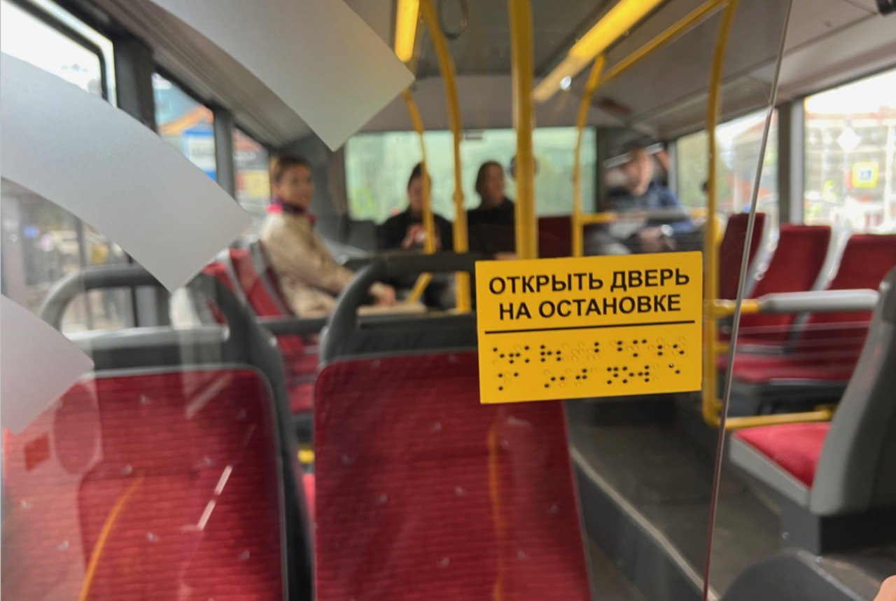 В ходе проверки установлено, что автотранспортное средство низкопольное, оборудовано пандусом для инвалидов-колясочников. Внутри салона транспортного средства предусмотрено пространство, предназначенное для размещения пассажиров-инвалидов, в том числе инвалидов в креслах-колясках. Текстовые тактильные информационные средства со шрифтом Брайля присутствовали. Осуществлялось звуковое оповещение остановок и информирование бегущей строкой. Входная группа транспортного средства отмечена пиктограммами о перевозке МГН и инвалидов. Однако, автобус проехал в конец остановочного пункта и инвалиду по зрению было затруднительно успеть осуществить посадку в транспортное средство. Кондуктор не представился, а также не предложил помощь пассажиру.