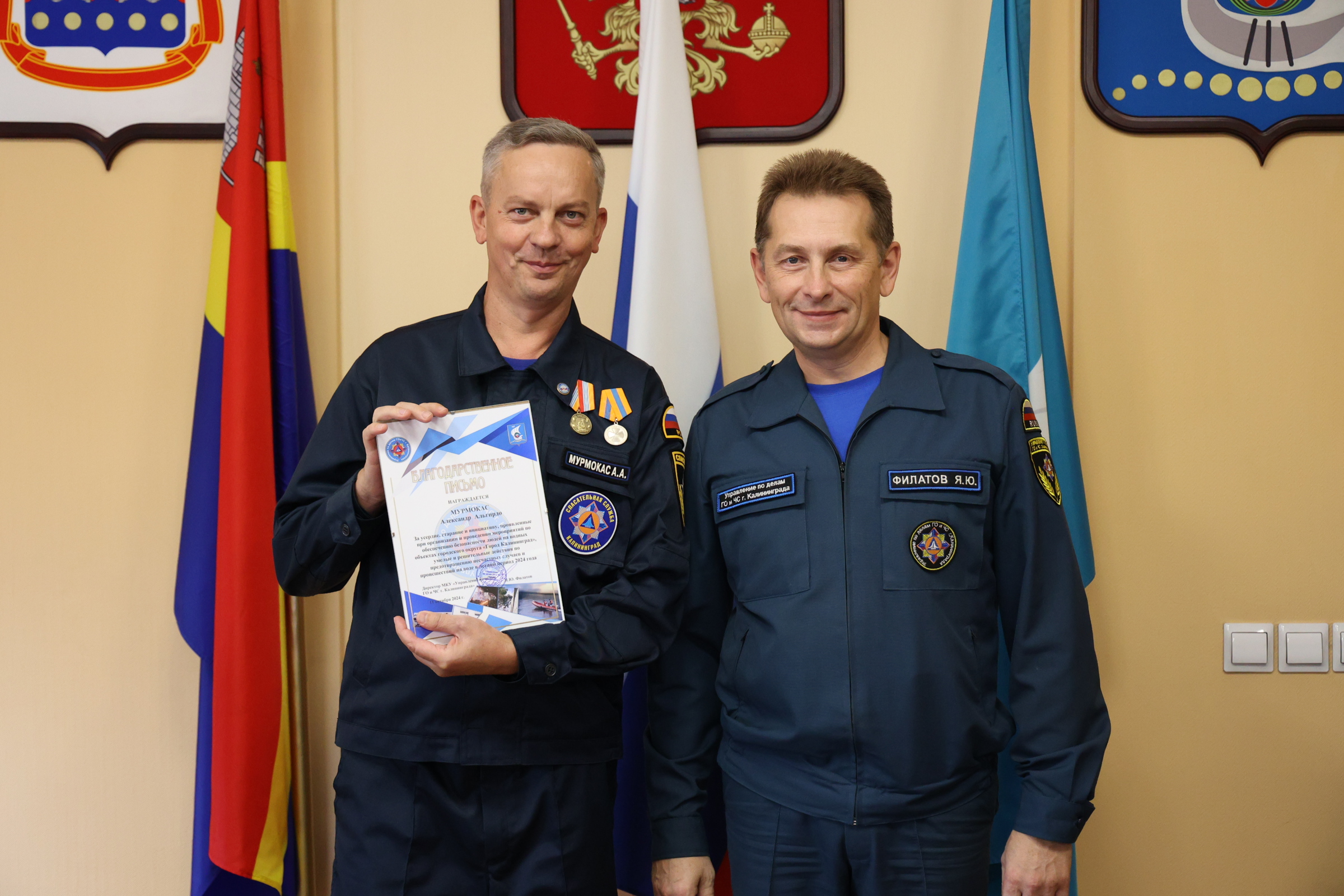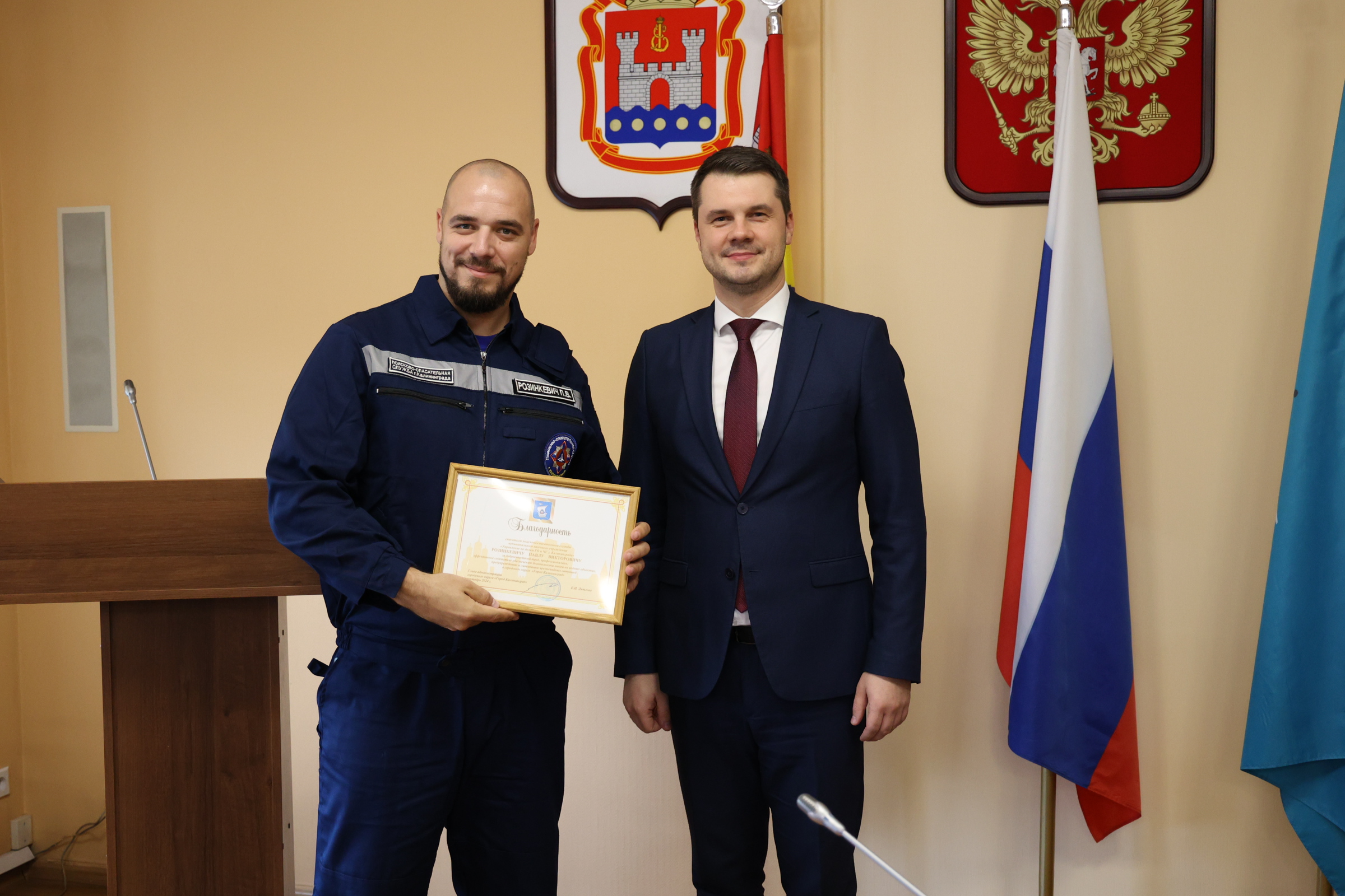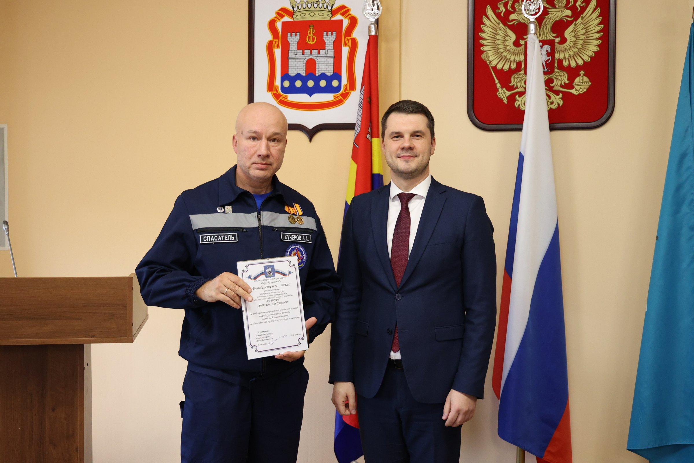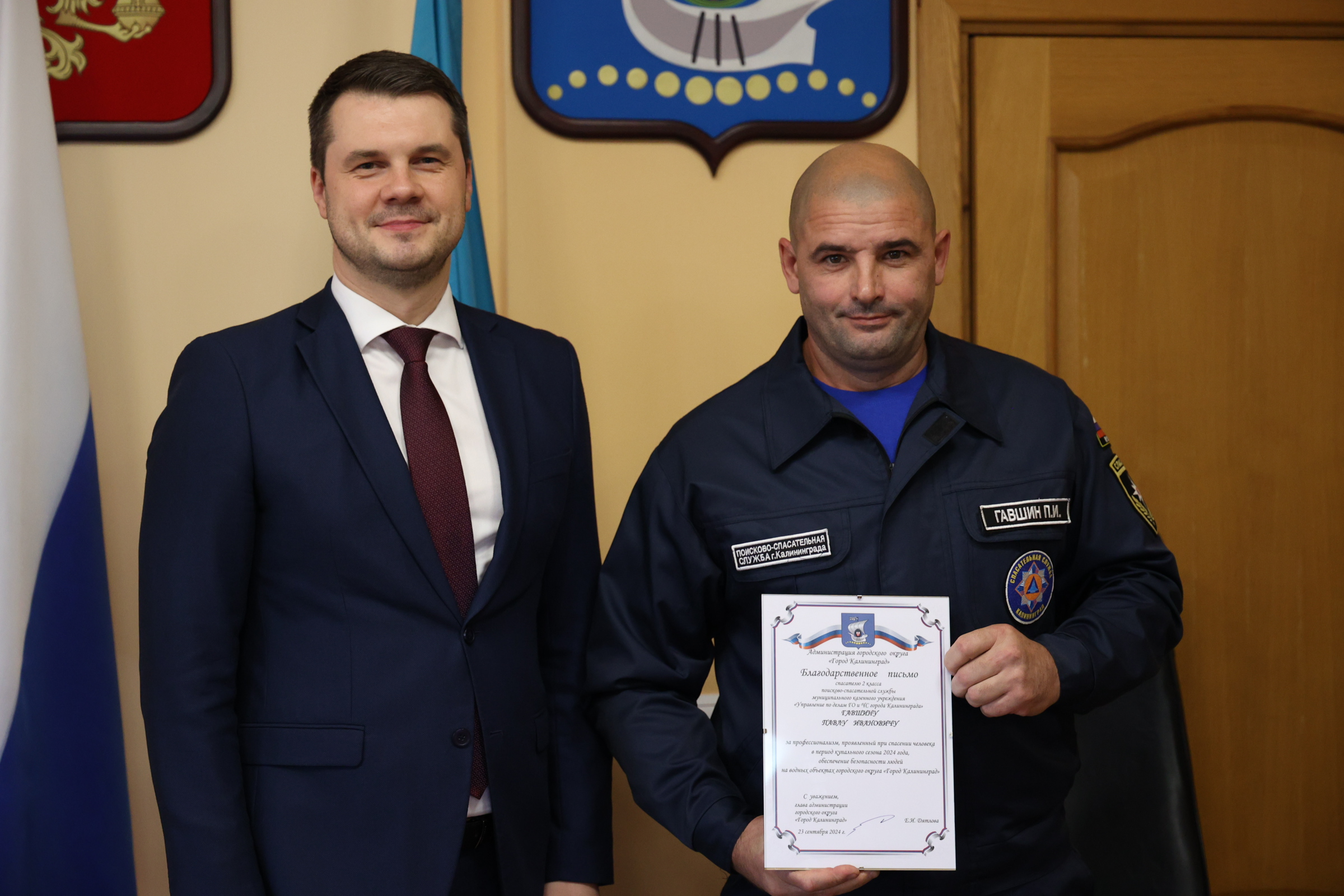 Сегодня и.о. главы администрации Калининграда Алексей Асмыкович вручил Благодарственные письма спасателям, наиболее отличившимся во время прошедшего купального сезона.