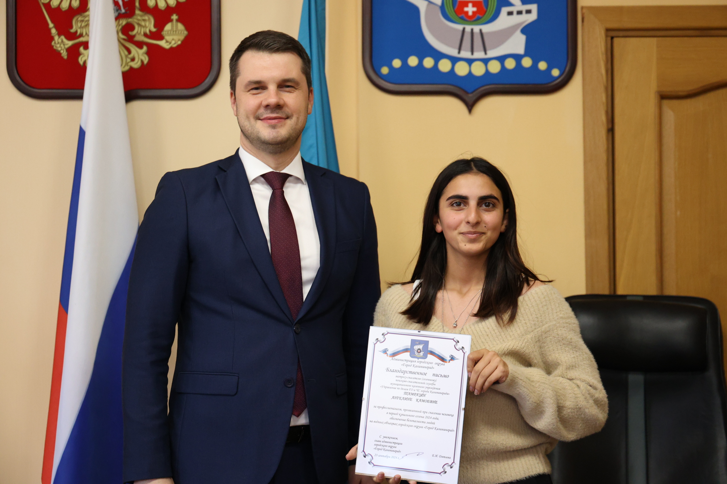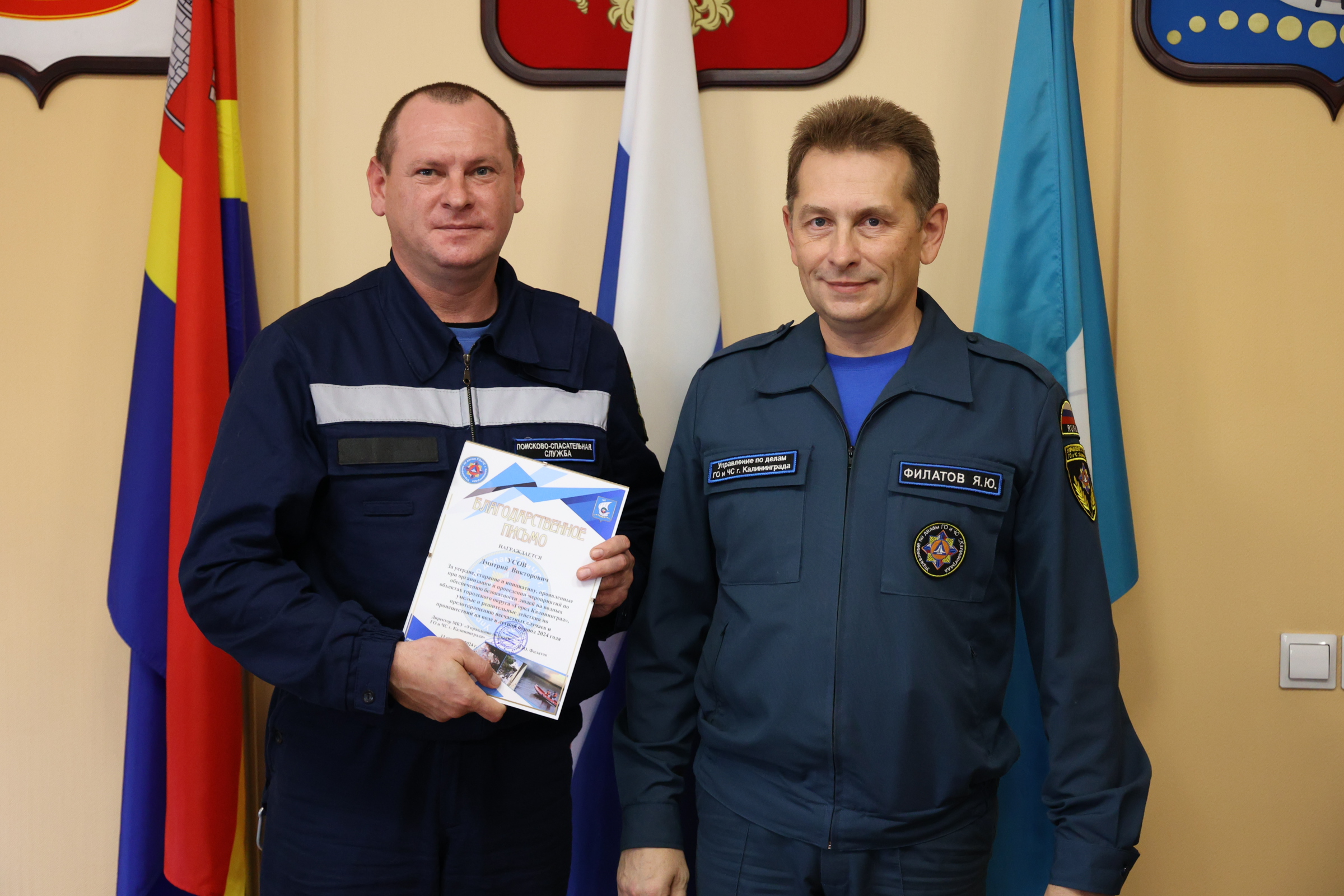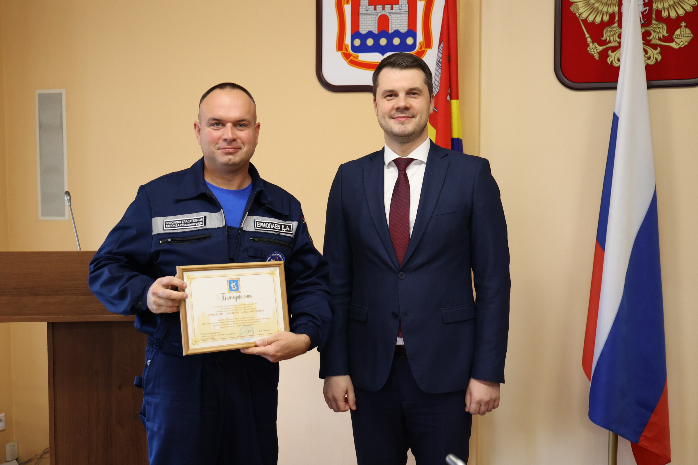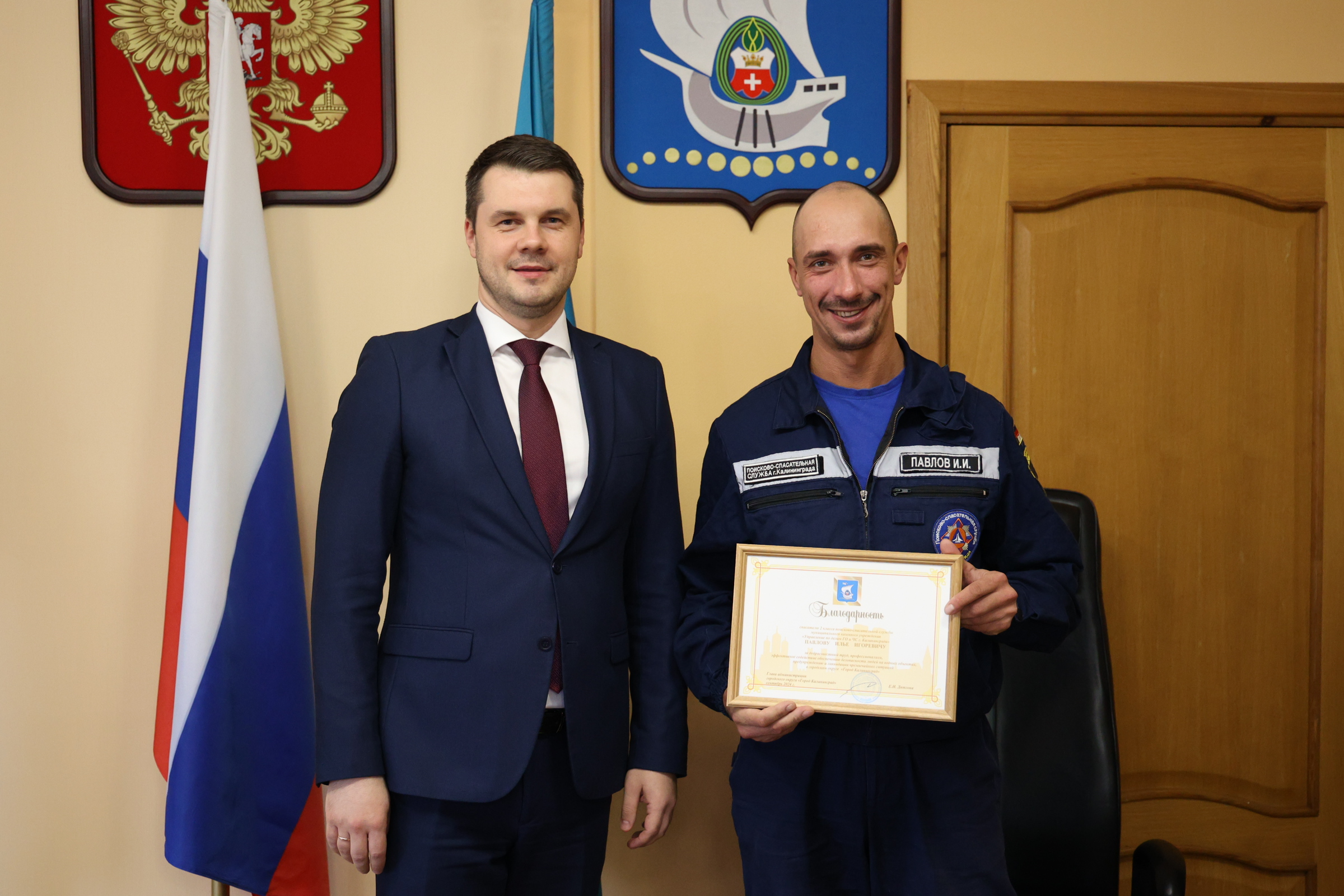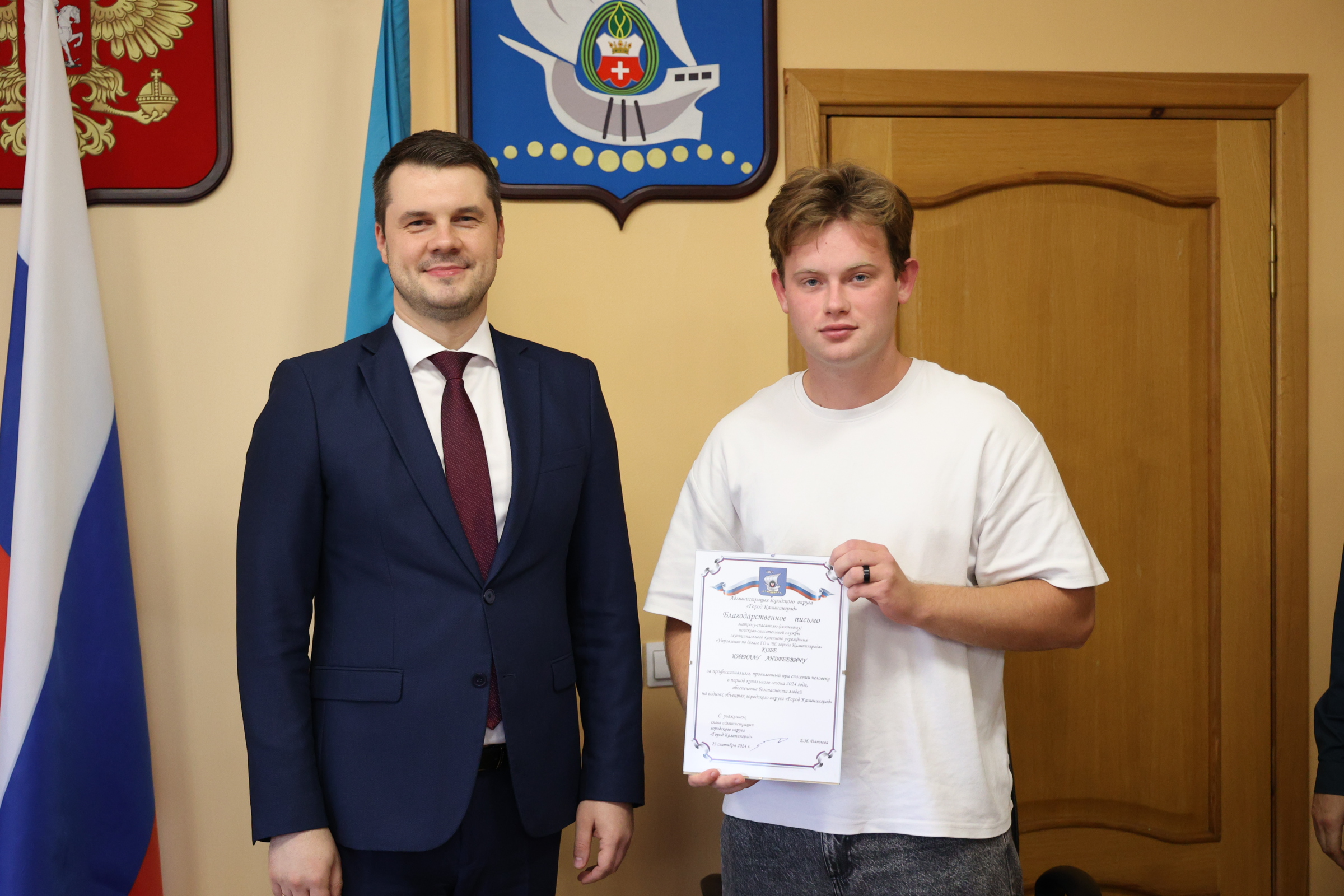 Сегодня и.о. главы администрации Калининграда Алексей Асмыкович вручил Благодарственные письма спасателям, наиболее отличившимся во время прошедшего купального сезона.