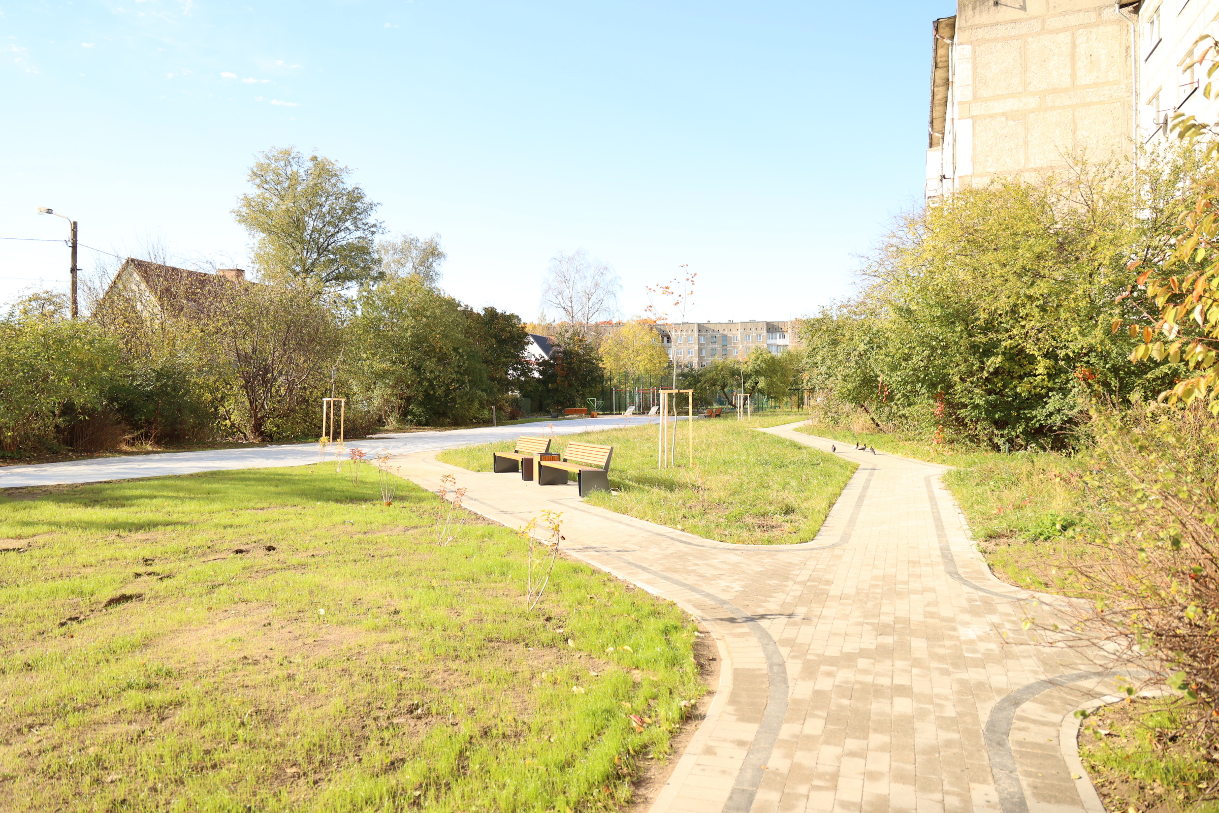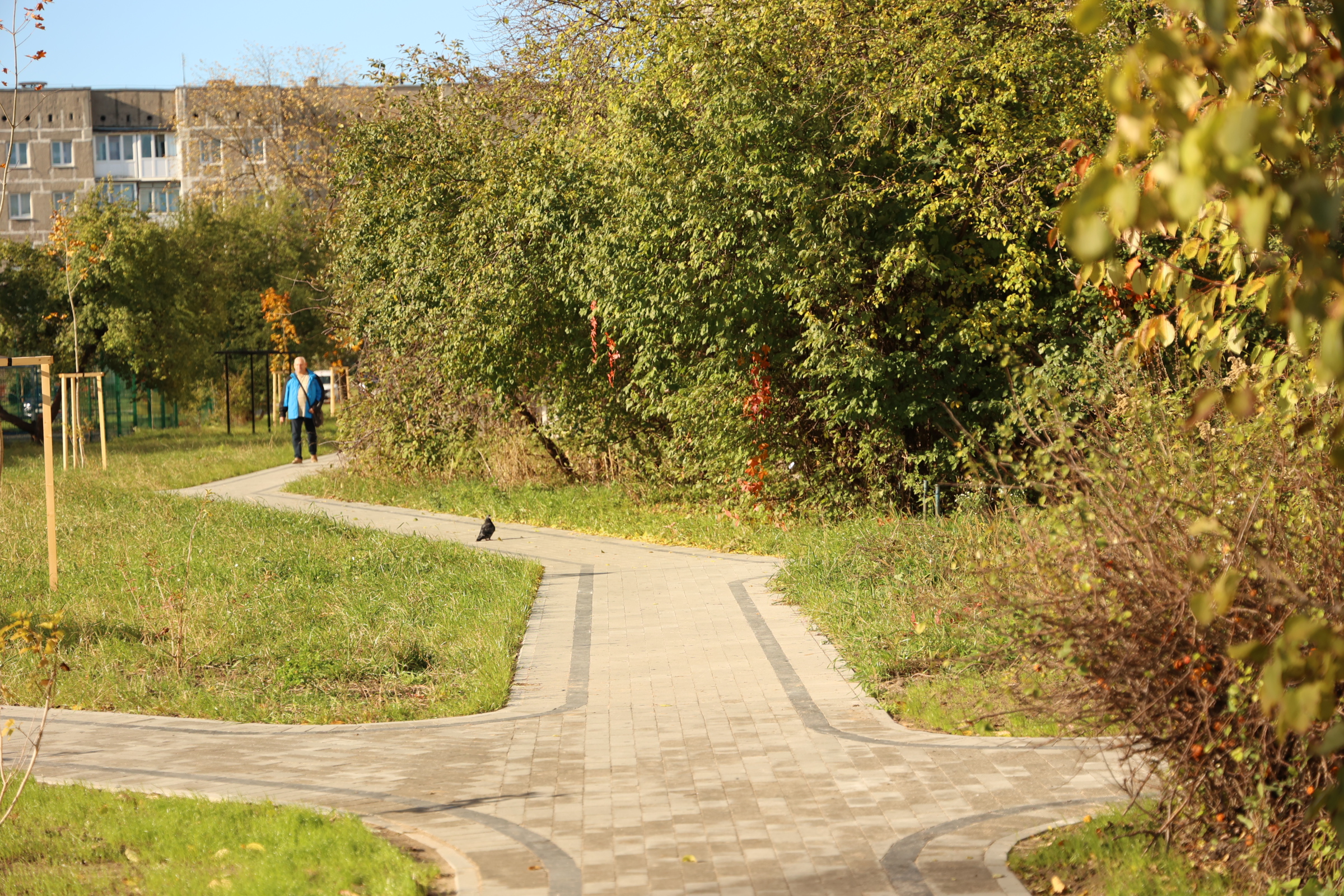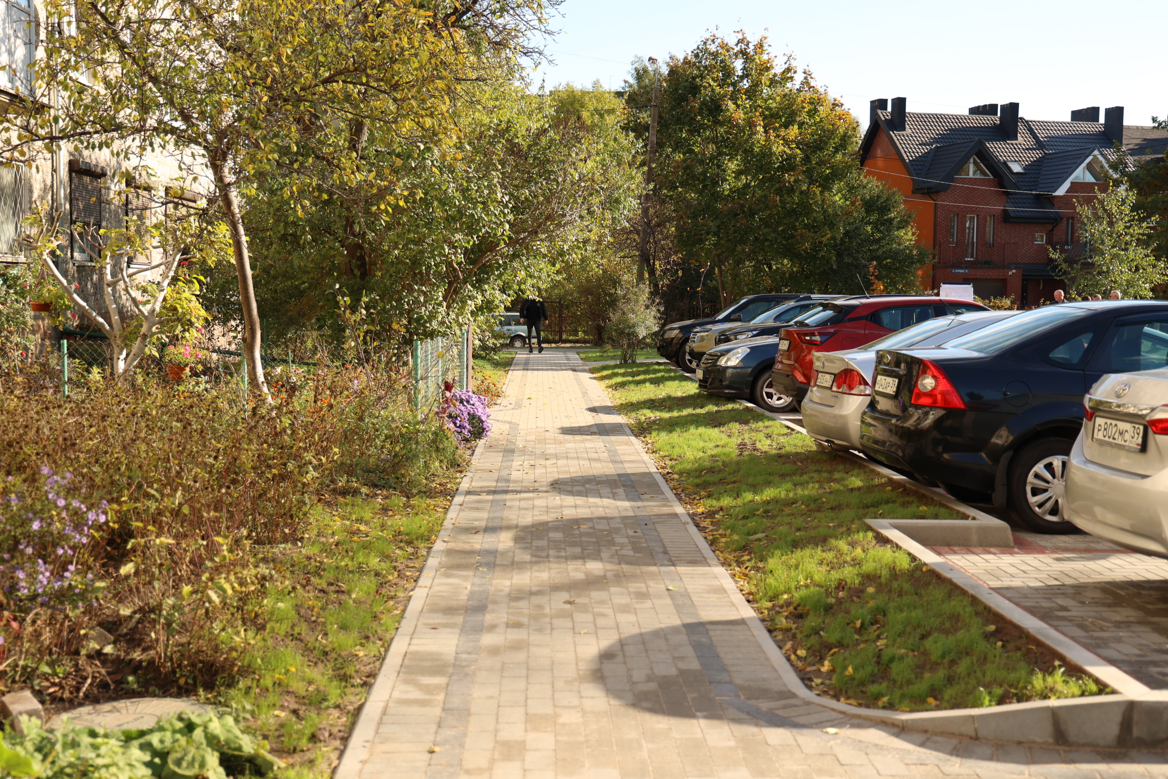 Работы должны были завершиться 10 октября, но фактически уже в начале месяца всё было готово. Двор – довольно большой, площадь обновлённых проездов – около полутора тысяч кв. метров, столько же – площадь выложенных плиткой тротуаров. На площади более 800 кв. метров оборудована парковка. Но самое большое пространство – 2, 5 тысячи кв. метров, отдано под газоны. Высажены 14 клёнов, более 30 кустарников и 20 метров живой изгороди.