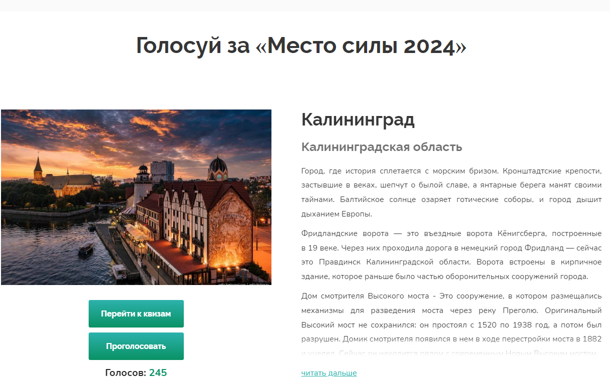 В 2024 году в пятёрку лучших мест силы России, выбранных по итогам Всероссийского голосования, вошёл Калининград – один из самых красивых и исторически примечательных городов страны. Этот уникальный город имеет все шансы стать «номером один» среди пятёрки финалистов – но лишь при условии, что интернет-пользователи активно проголосуют за него на сайте проекта.
