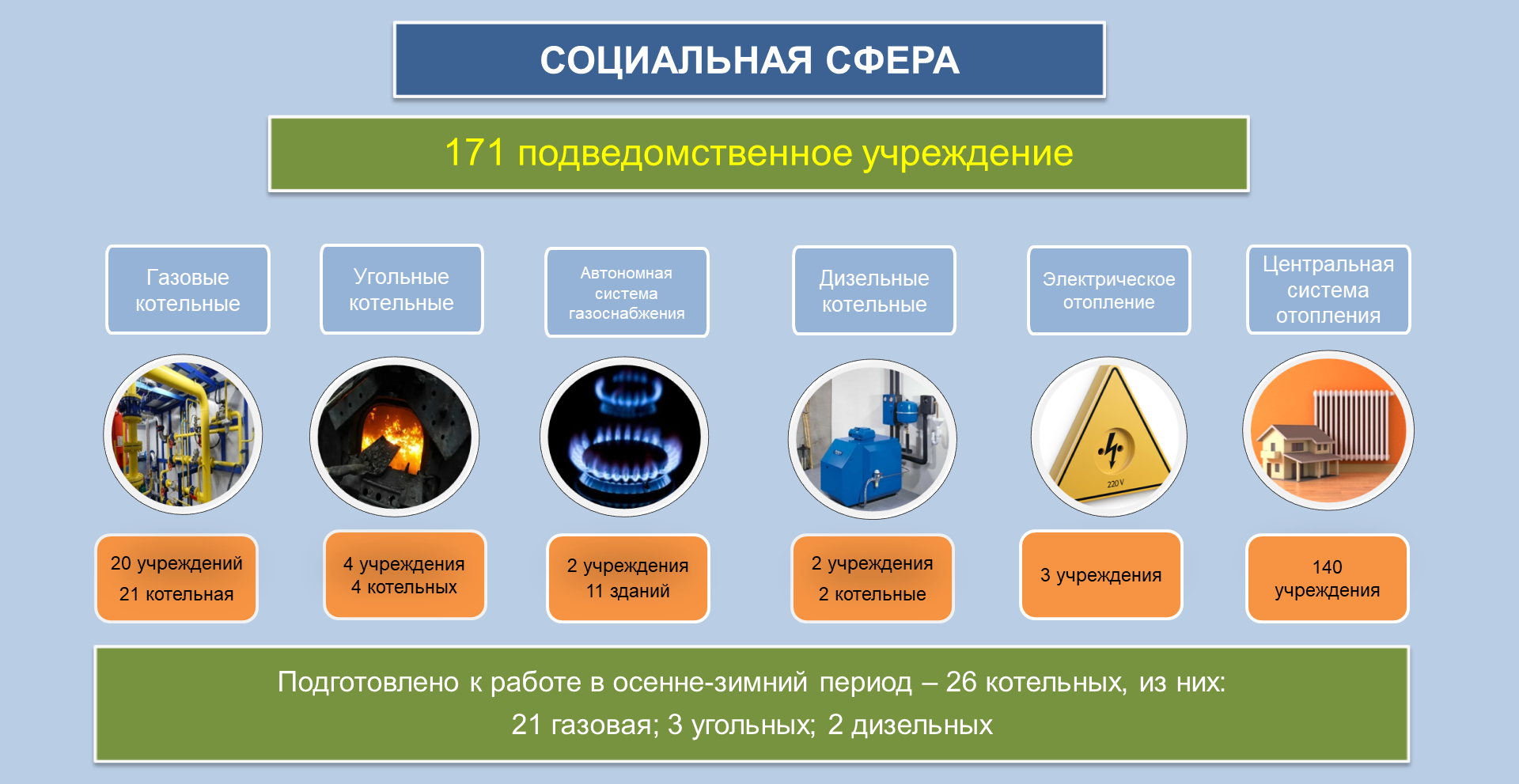 Сеть учреждений социальной сферы включает в себя 171 учреждение, на балансе 24 учреждений находится 27 котельных (21 газовая, 4 угольных, 2 котельные работают на дизельном топливе, 2 учреждения подключены к автономной системе газоснабжения, 3 учреждения имеют электрическое отопление). На сегодняшний день все котельные готовы к работе в осенне-зимний период. Остальные учреждения подключены к централизованной системе теплоснабжения.