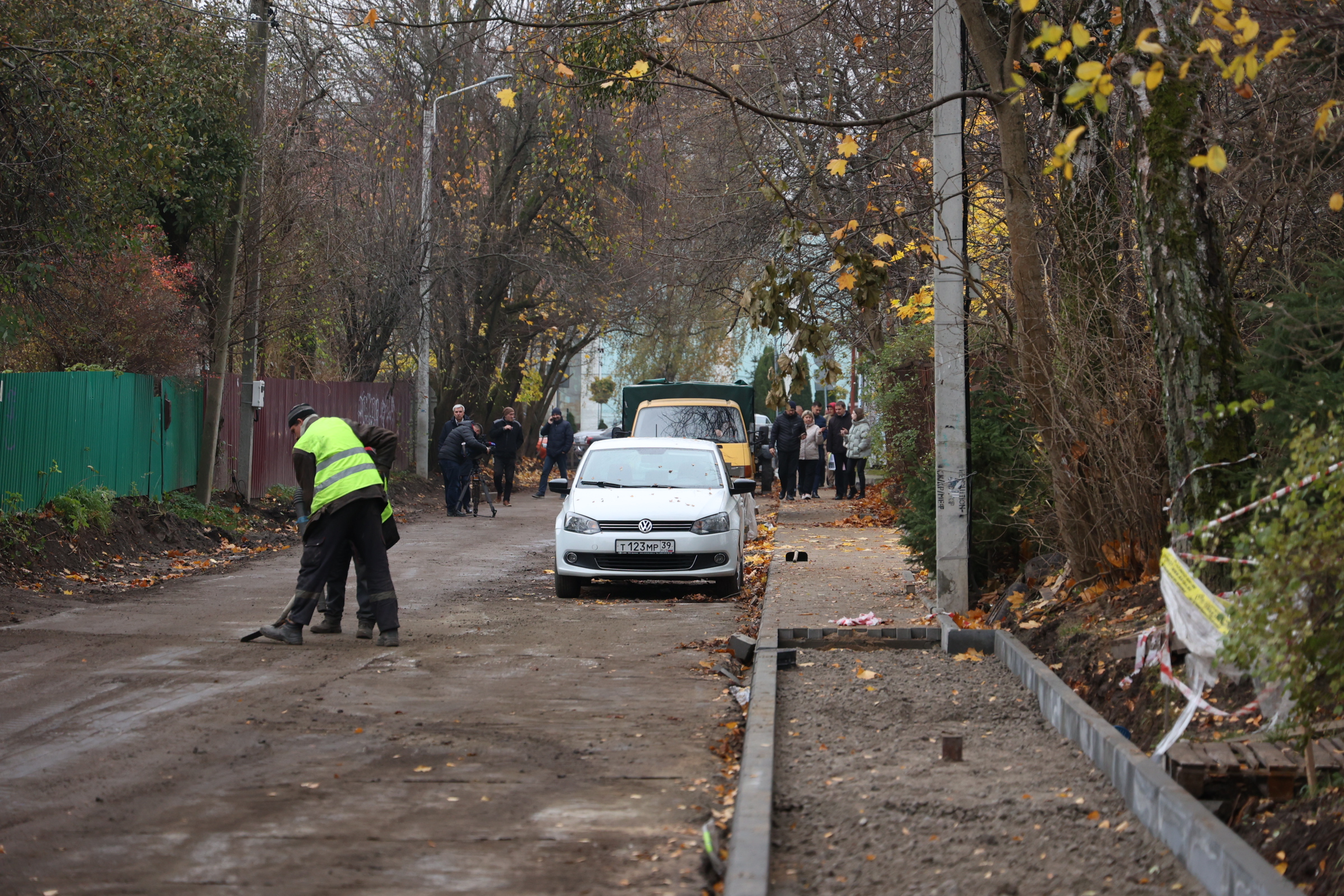 Осмотр глава начала с участков улицы Закавказской. Стоимость контракта по ним составила 7 712 276 рублей. Работы практически завершены, но Елена Дятлова указала на необходимость ликвидации пары небольших просадок, в которых после дождя скапливается вода. Также она дала поручение проработать вопрос возможности высадки зелёных насаждений здесь уже этой осенью.
