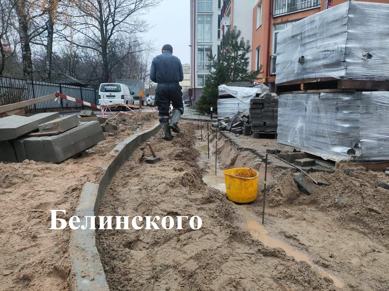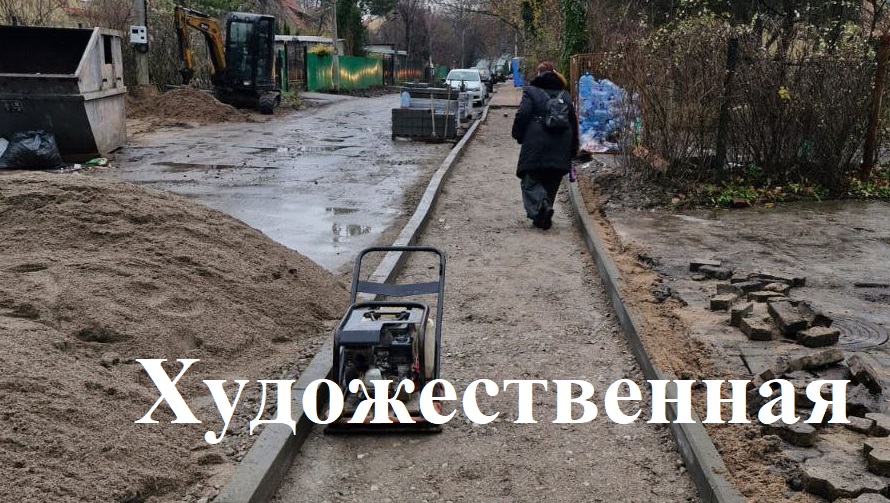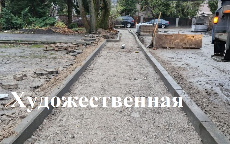 На тротуарах по Белинского идёт устройство основания, установка бортового камня; на Художественной – установка борта, устройство песчаного и щебёночного основания; на Чкалова – разработка грунта, установка борта, устройство основания из песка и щебня; пер. Грига – устройство борта, мощение плиткой; на проспекте Победы у парка – устройство песчано-щебёночного основания; на Людникова/Галковского – укладка плитки, установка бортового камня.