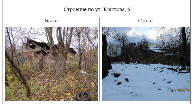 Для очистки территории в ноябре 2024 года от бесхозяйных объектов, представляющих угрозу для здоровья и жизни жителей города, были демонтированы строения, расположенные по ул. Крылова, 6 и по ул. Ломоносова, 99.