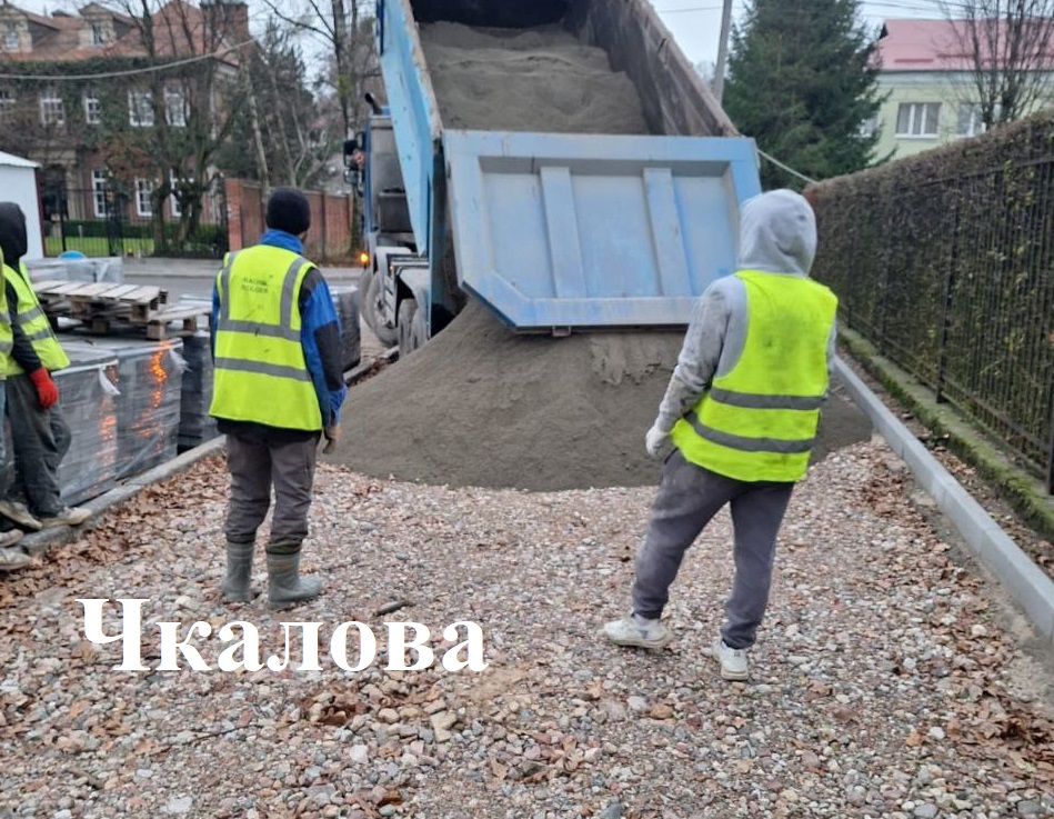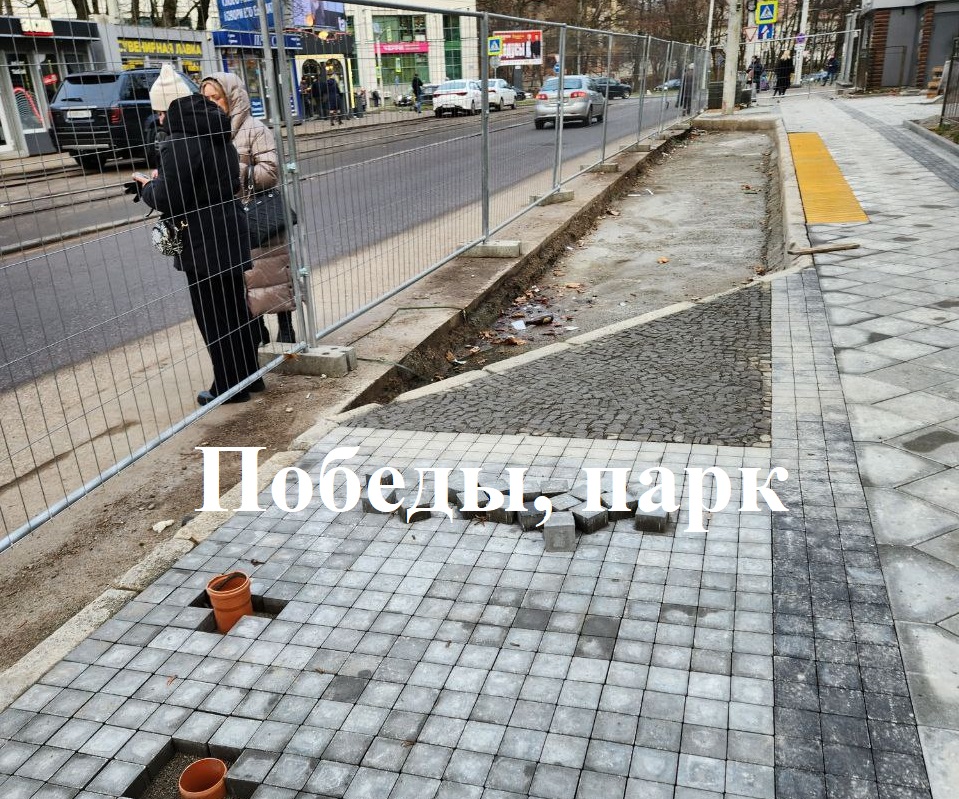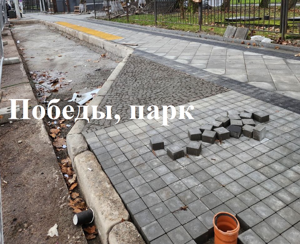 На тротуарах по Белинского – устройство щебёночного основания, установка бортового камня; на Художественной – установка борта, устройство песчаного и щебёночного основания; на Чкалова, где срок контракта истекает на следующей неделе, количество рабочих и механизмов, а также общий ход работ на тротуаре специалисты контролируют ежедневно, здесь – установка борта, устройство основания из песка и щебня, мощение плиткой; пер. Грига – устройство песчаного и щебёночного основания; на проспекте Победы у парка – демонтаж старого покрытия, устройство песчано-щебёночного основания, установка борта, мощение; на Людникова / Галковского – устройство основания, укладка плитки, установка бортового камня.