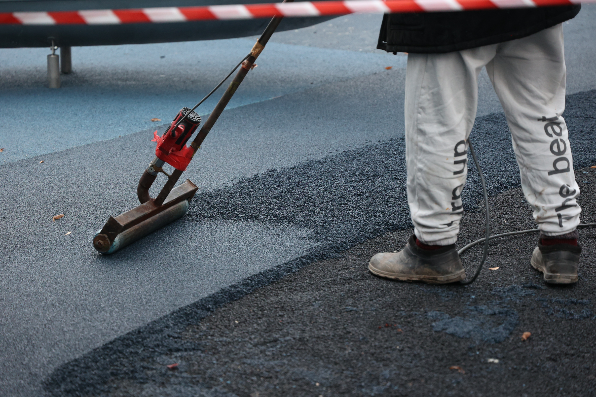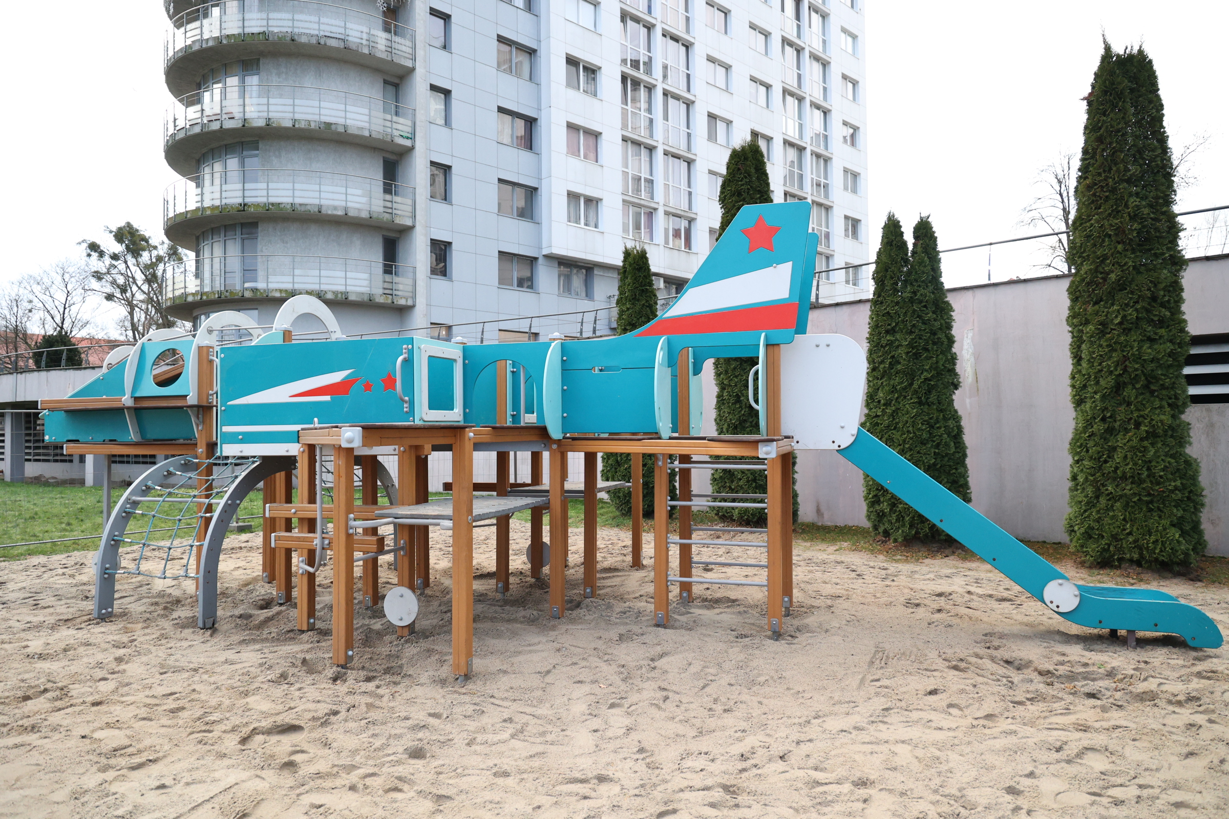 Игровой комплекс полностью смонтирован, завершаются работы по устройству покрытия. Оно – травмобезопасное, с резиновой крошкой различной толщины смягчающего слоя. Его толщина подобрана с учетом величины высоты падения от 30 мм до 130мм. На покрытие нанесен стилизованный рисунок с космической тематикой.