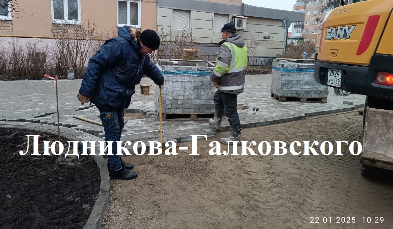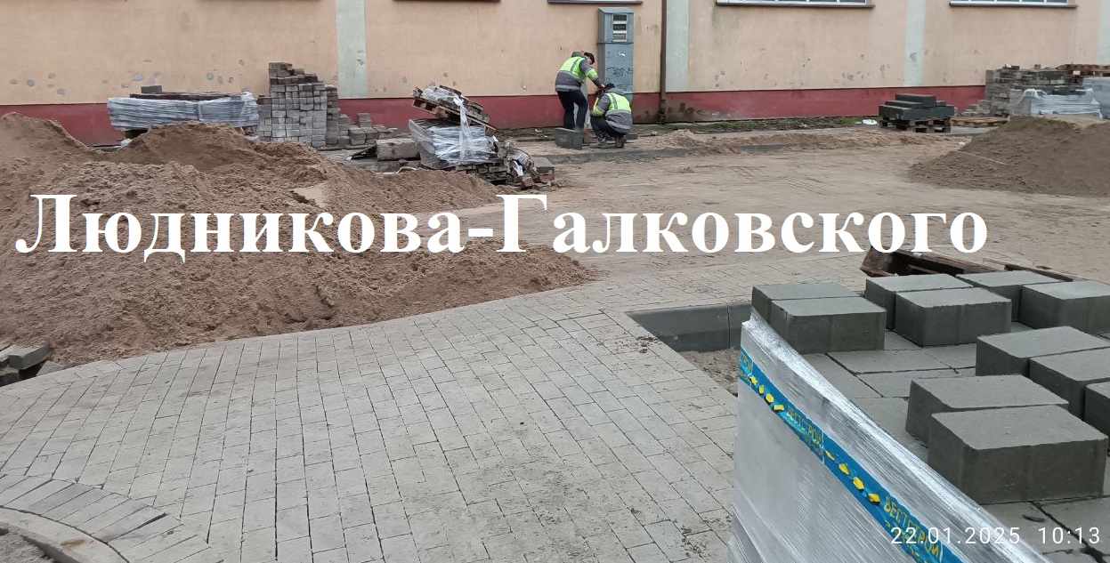 На различных участках тротуаров по переулку Грига, улицам Ген.-полк. Людникова и М. Галковского продолжают готовить основание, укладывают плитку, монтируют бортовой камень.