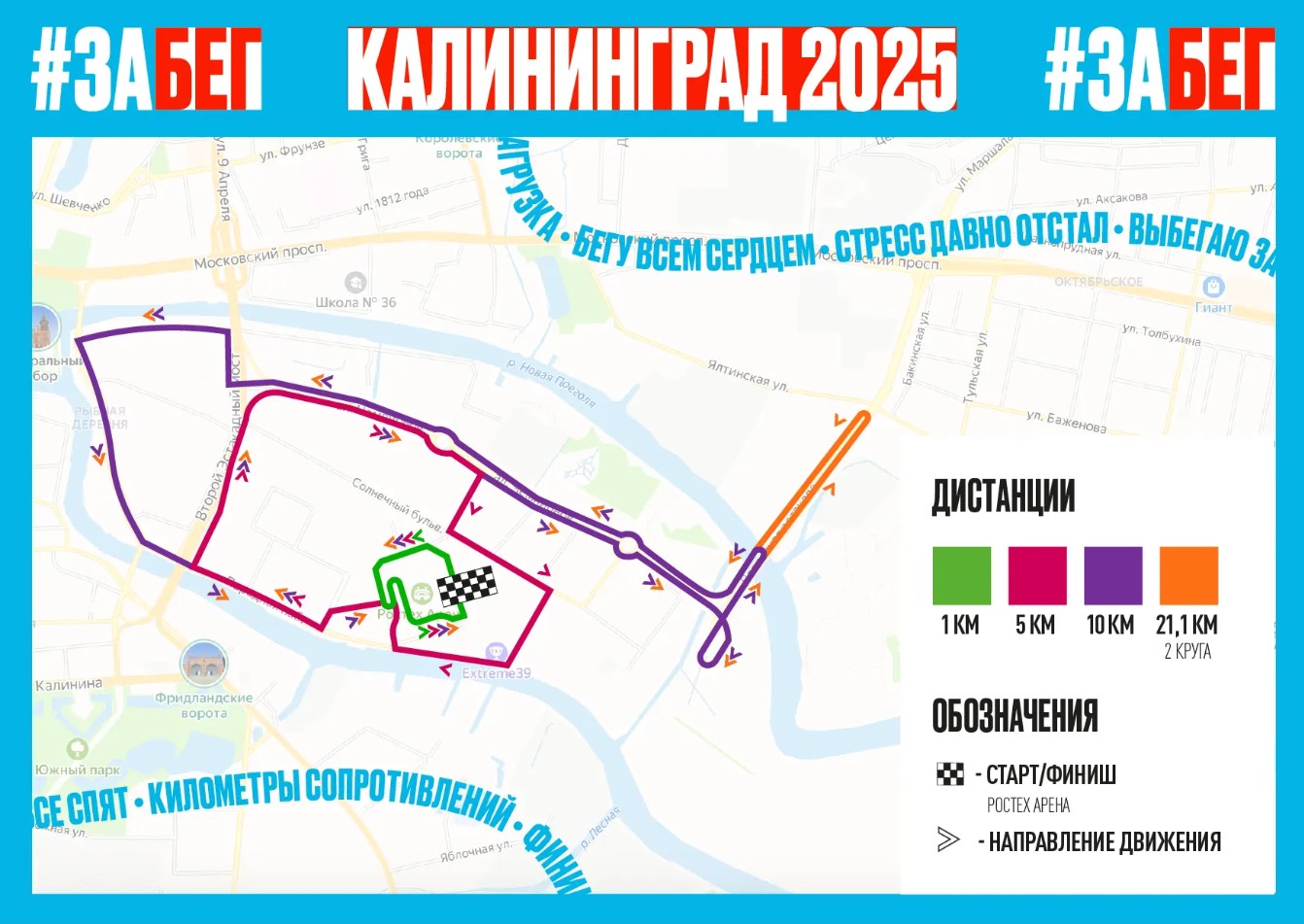 ЗаБег.рф - это масштабный спортивный фестиваль в каждом городе! Место проведения в г. Калининграде - Стадион Ростех Арена, Солнечный бульвар, 25 а. вход 1 и 2. Первый старт в 8.00.