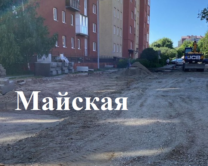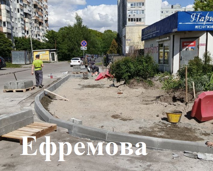 На Полк. Ефремова устанавливают борт и поребрик, устраивают песчаное и щебёночное основание, укладывают плитку, переносят ливнёвку; на Майской устраивают основания под дорогу и тротуар, устанавливают бортовой камень, прокладывают кабельную и дождевую канализацию.