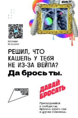 Материалы кампании помогают принять решение оставить зависимость в прошлом. Решил, что кашель не из-за вейпа? Считаешь, что курение электронных сигарет не вредно и это просто «клубничный пар»? Да брось ты!