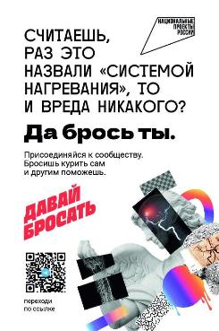 Помогает сказать «нет» курению электронных сигарет, вейпов и иных устройств сообщества «Давай бросать» в мессенджере «Телеграм» и в социальной сети «Вконтакте», которое развивается по нацпроекту «Продолжительная и активная жизнь».