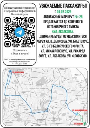 Маршрут №26 продлевается до конечной остановки «ул. Аксакова» - с кольца на Маршала Покрышкина по улицам Виктора Денисова, Брестской, 3-го Белорусского фронта, Михайловской, Рихарда Зорге, Аксакова, Флотской - с разворотом на новом кольце у школы №56 и возвращением по улицам микрорайона «Восток» на Молодой гвардии и свой маршрут.