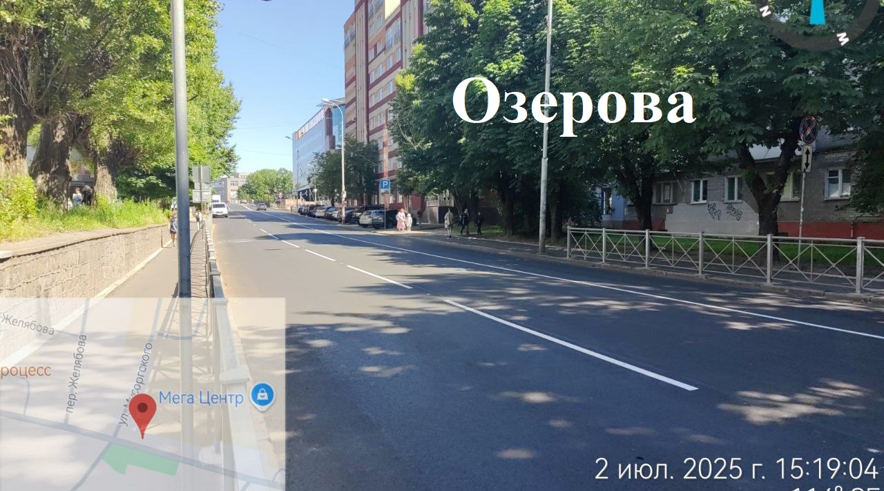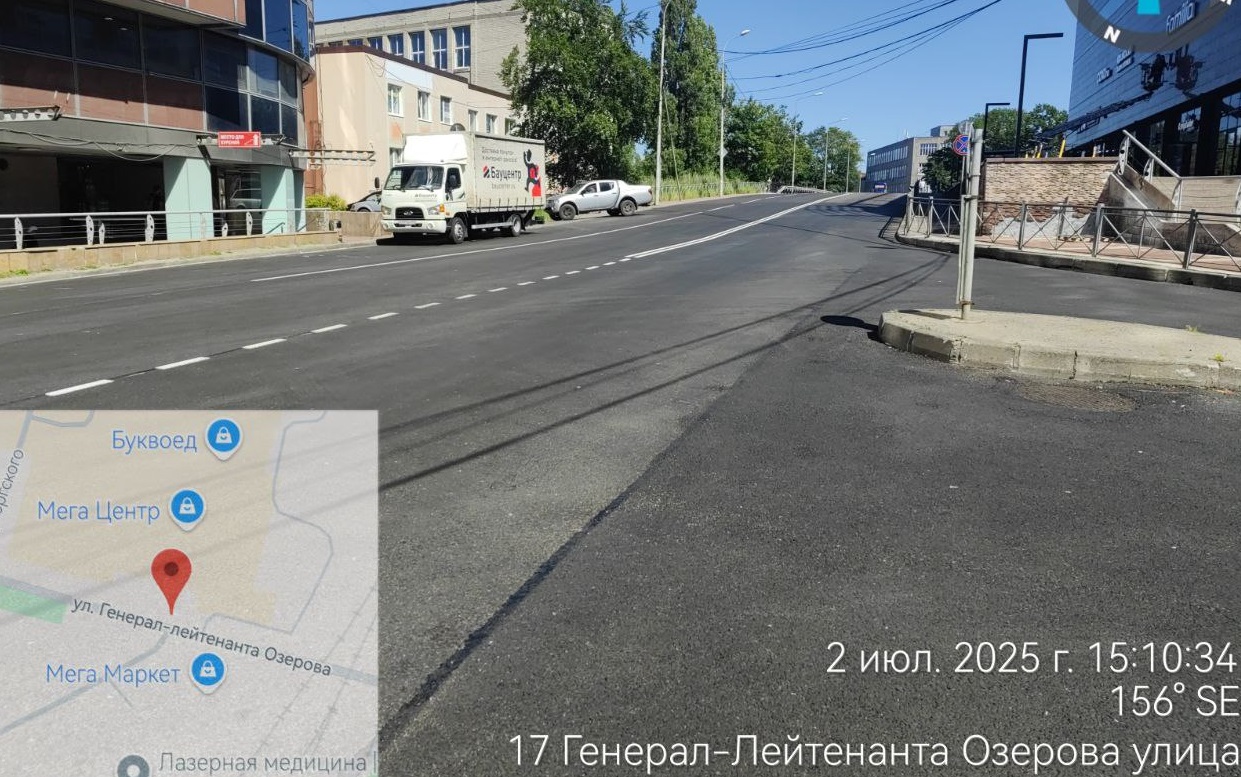 На Ген.-лейт. Озерова ремонт тротуаров и проезжей части завершён, движение возобновлено в обоих направлениях, но предстоит по текущему содержанию ещё ликвидировать ряд дефектов в границах объекта – понижения, уклоны, застои воды.