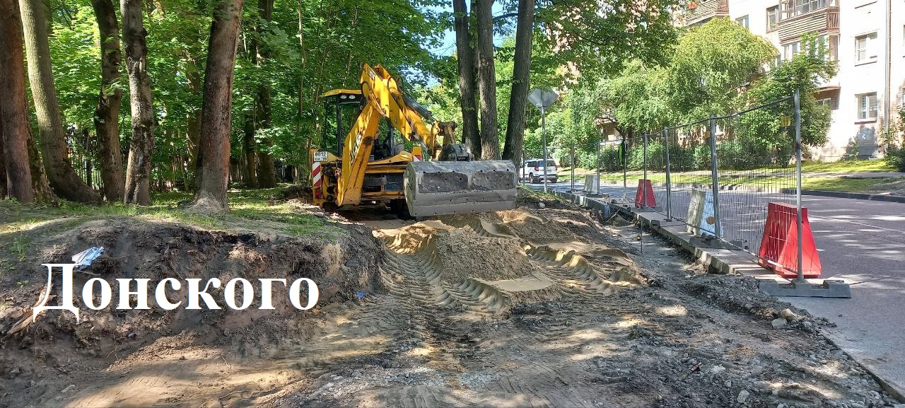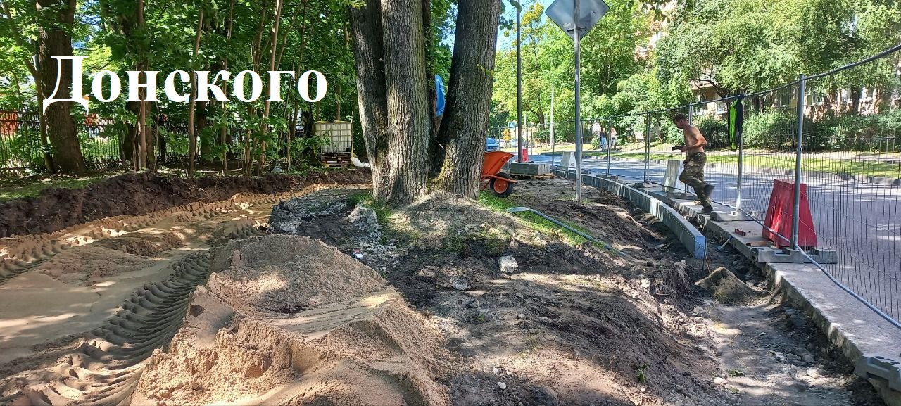 Продолжаются капитальные работы и на других дорожных участках: на тротуаре по Дмитрия Донского монтируют бортовой камень, демонтируют старый асфальт с тротуара, готовят песчаное основание, также продолжают ровнять и расчищать площадку под будущую парковку у детской больницы.