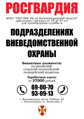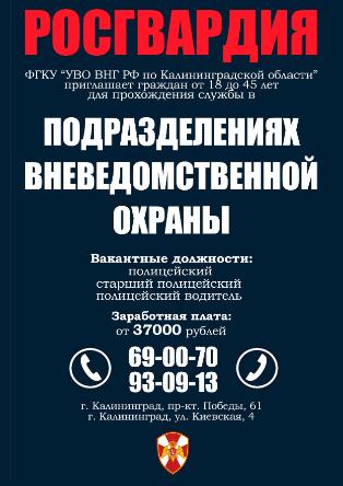 ФГКУ «УВО ВНГ России по Калининградской области» объявляет набор граждан от 18 до 45 лет для прохождения службы в подразделениях вневедомственной охраны.