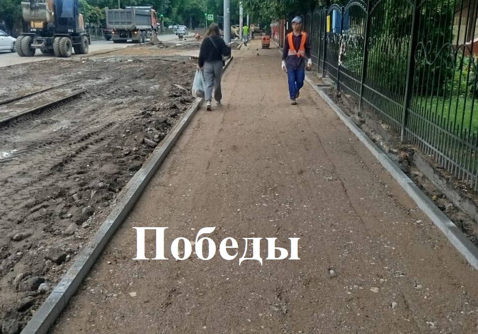На Дмитрия Донского у детской больницы готовят песчаное основание тротуара и площадку под парковку. На проспекте Победы выставляют борт, готовят основание из щебня и песка на очередном этапе, уже ближе к Радищева.