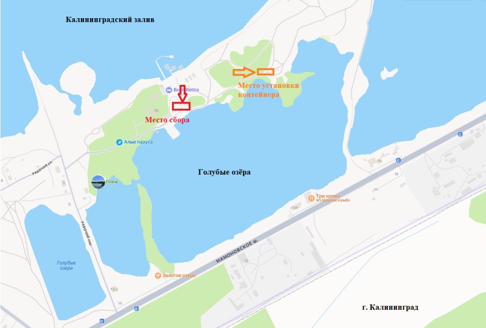 Мероприятие по очищению берегов залива от мусора пройдет 9 августа в 10:00 по адресу: Калининград, Рабочий переулок, 7В. Место встречи обозначено на схеме.
