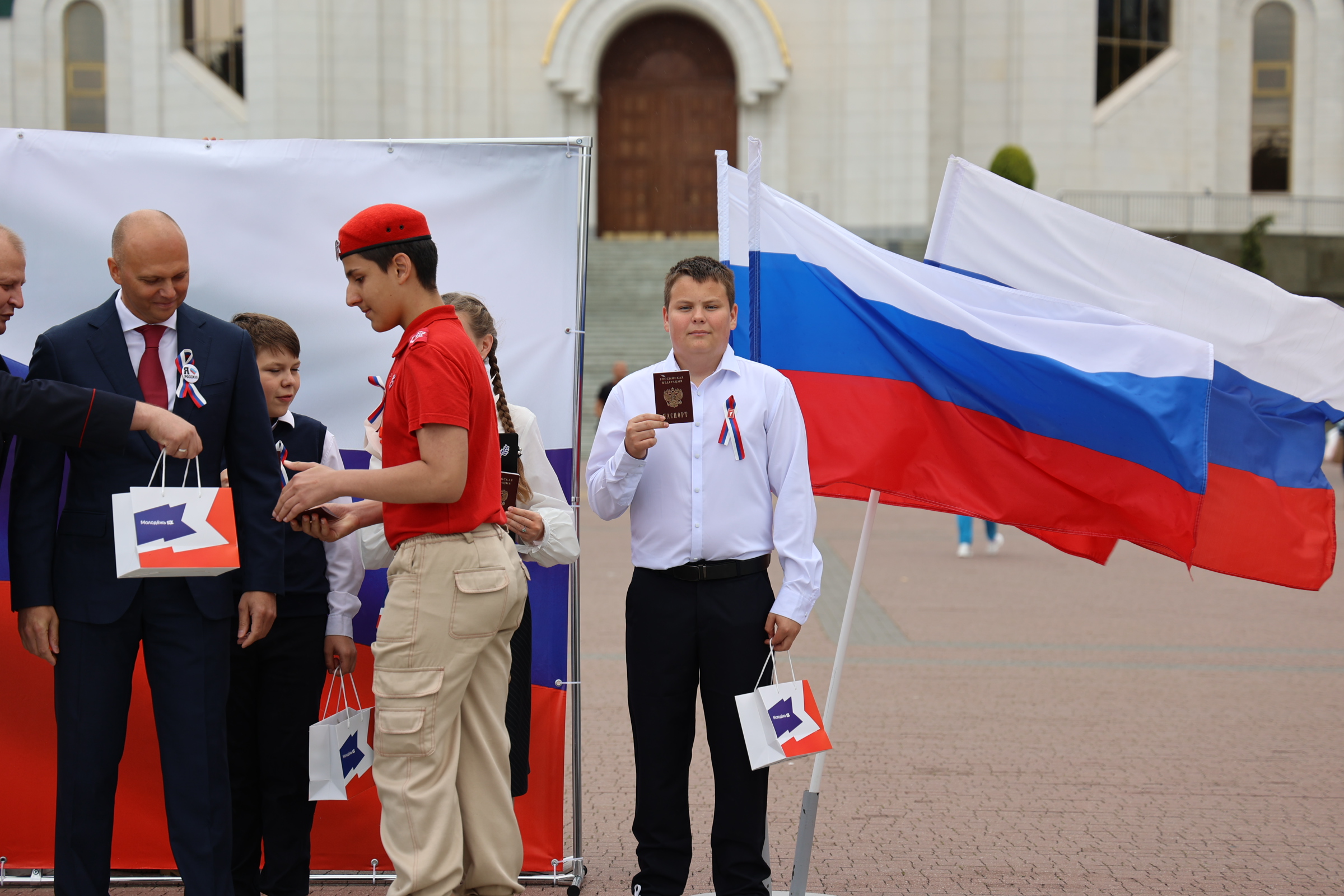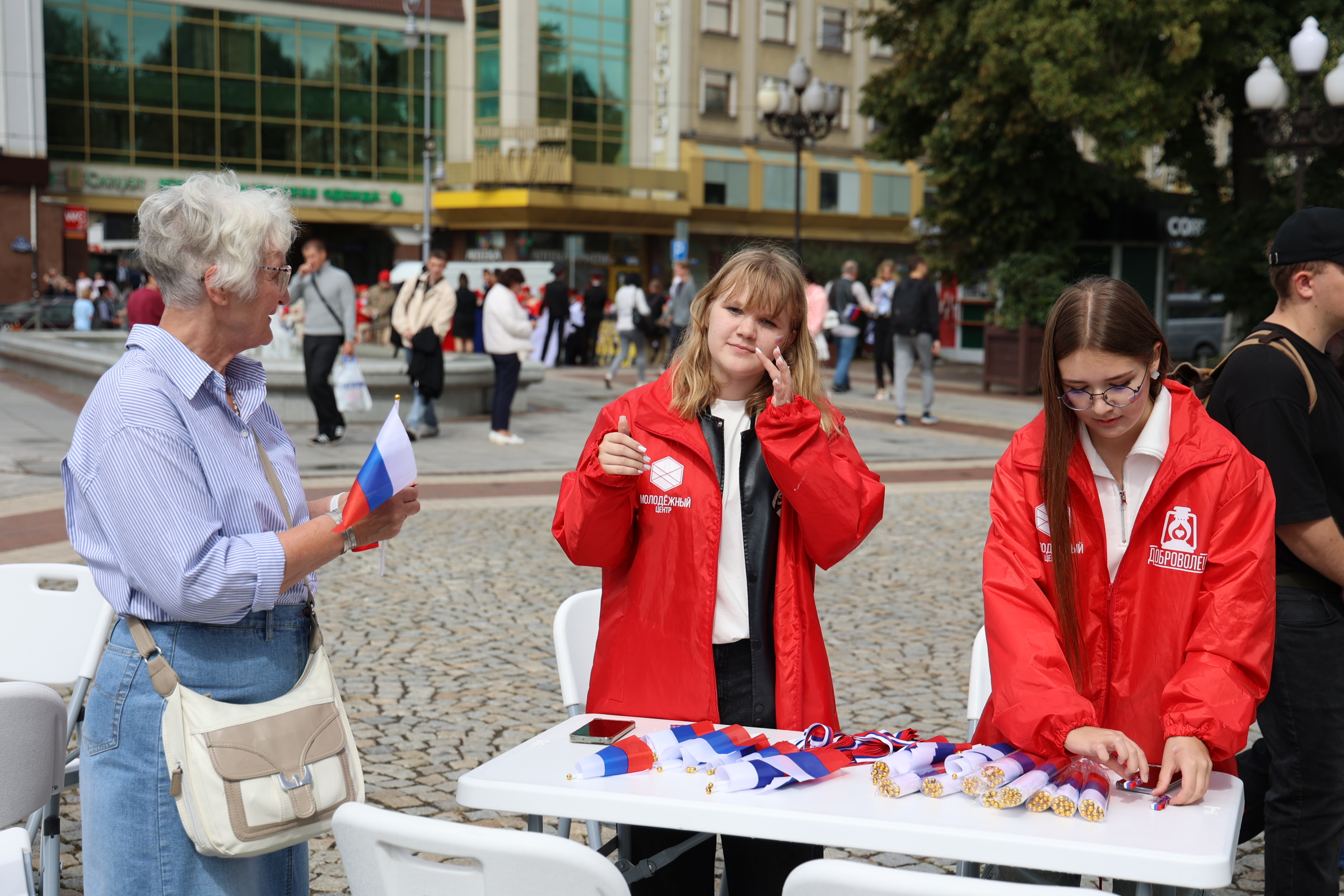 Активисты регионального отделения «Движения первых» и Всероссийского общественного движения «Волонтёры Победы» раздали около 2000 лент и 500 флажков в цветах российского флага.