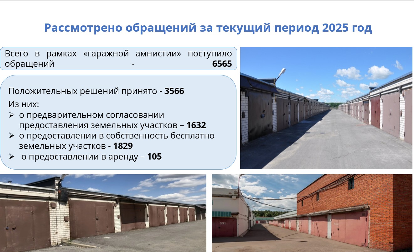 Всего в рамках «гаражной амнистии» поступило 6565 обращений, принято положительных решений — 3566. Из них предоставлено земельных участков: в собственность бесплатно — 1829, в предварительное согласование — 1632, в аренду — 105.