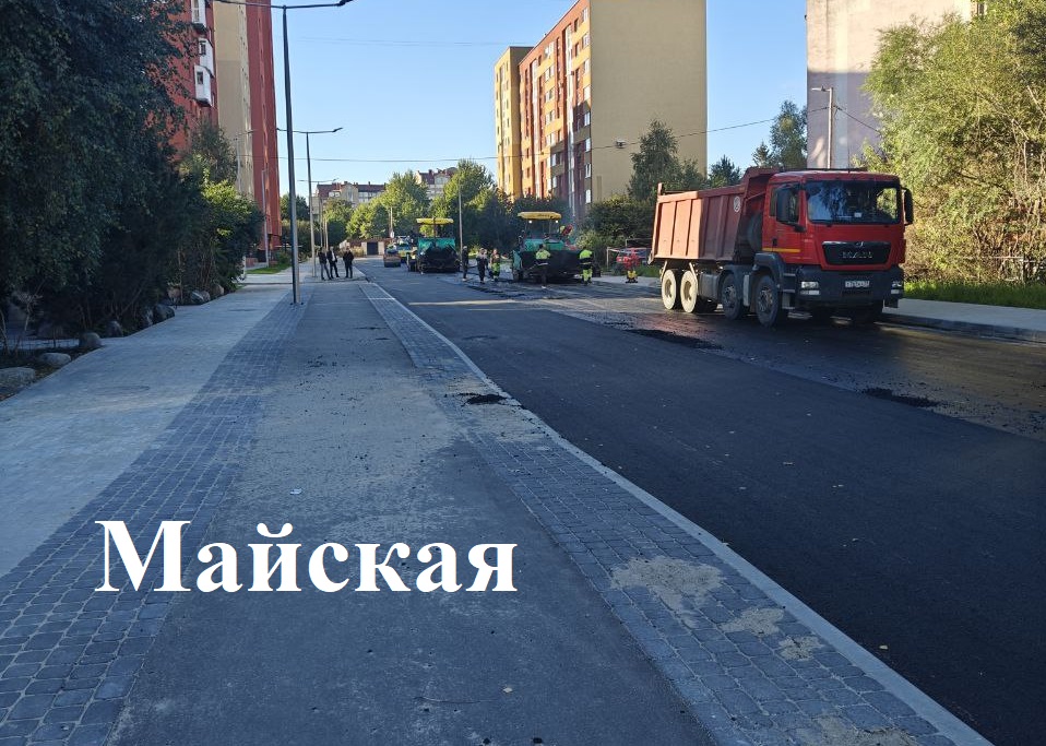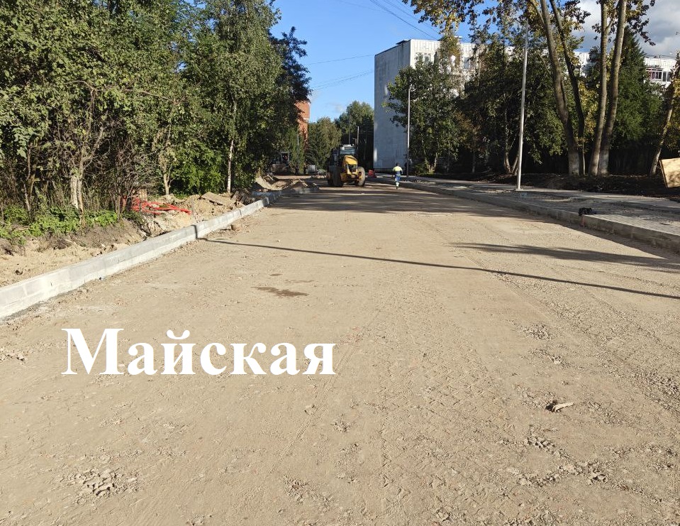На Майской от одноименного переулка до ул. Парт. Железняка закатывают верхний слой асфальтобетона, от Железняка до Еловой аллеи в пятницу должны уложить нижний слой.
