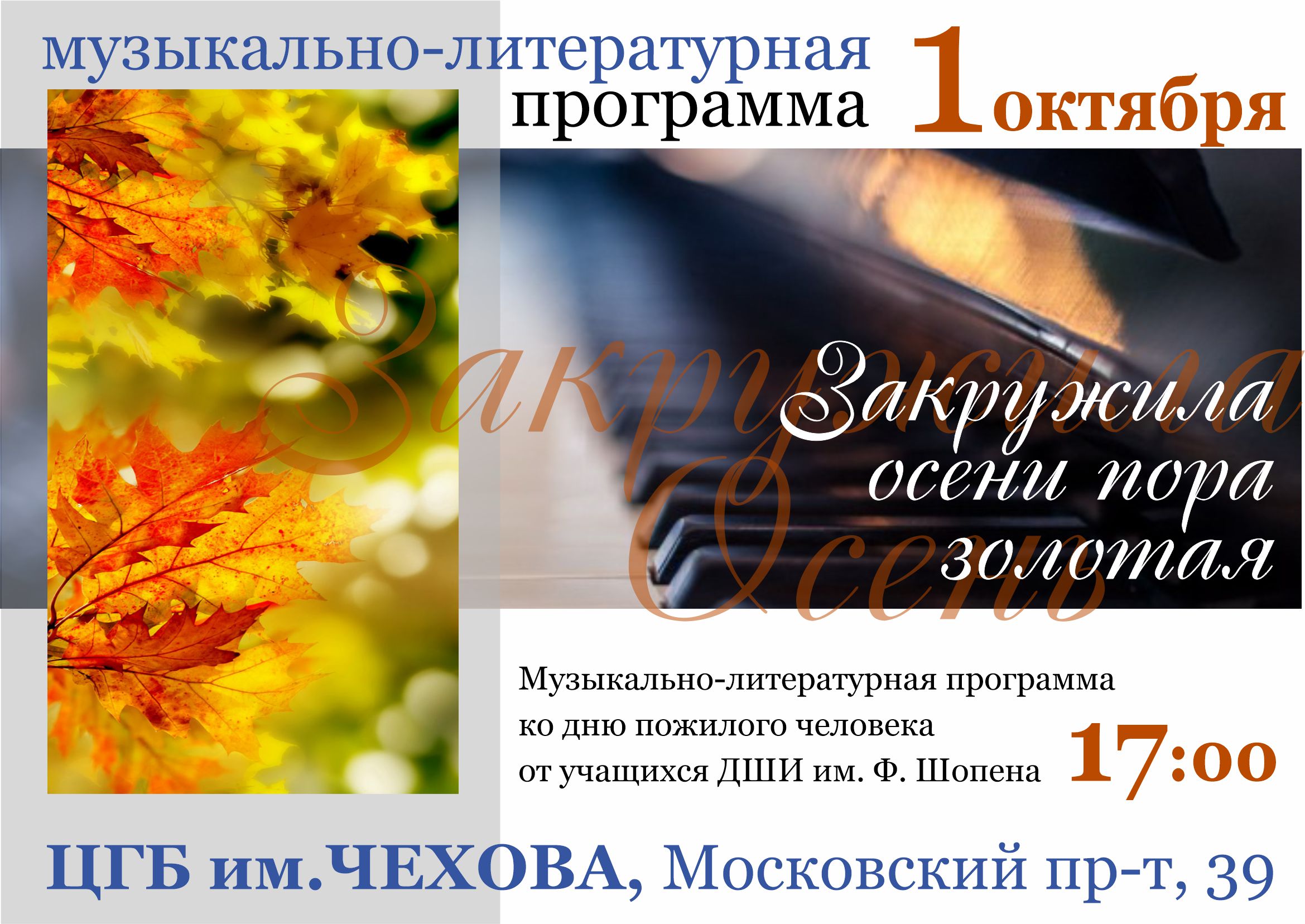 1 октября в 17.00 в Библиотеке имени А.П. Чехова пройдёт музыкально-литературная программа к Международному Дню пожилого человека «Закружила осени пора золотая…» от учащихся ДШИ имени Ф. Шопена.