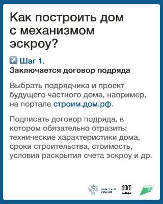 Выберите проект дома и подрядчика. Договор должен содержать все условия: стоимость, сроки, технические характеристики и порядок открытия счета эскроу. Проект можно подобрать на портале строим.дом.рф