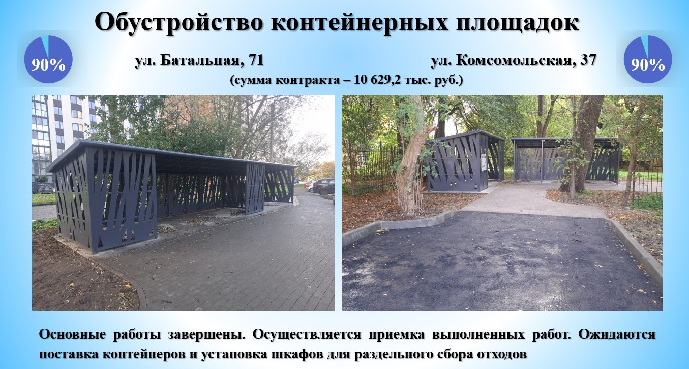 На контейнерной площадке по пер. Майский, 1 установлен металлический навес, ожидается поставка пластиковых контейнеров. На контейнерных площадках по ул. Батальной, 71 и ул. Комсомольской основные работы завершены. Ожидаются поставка контейнеров и установка шкафов для раздельного сбора отходов. Срок исполнения муниципального контракта – 12 ноября. На контейнерной площадке по ул. П. Морозова, 101-113 выполняются работы по установке бортового камня. Срок исполнения муниципального контракта – 30 ноября.
