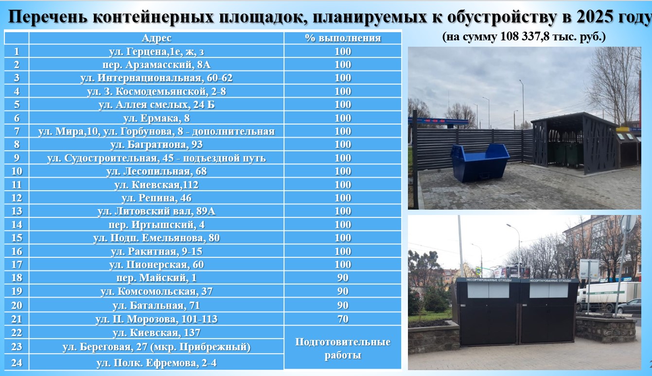 За счет средств экономии, сложившейся по результатам закупочных процедур до конца года запланировано обустройство 3 контейнерных площадок: по ул. Киевская, 137, по ул. Береговая, 27 (микрорайон Прибрежный) по ул. Полк. Ефремова, 2-4.