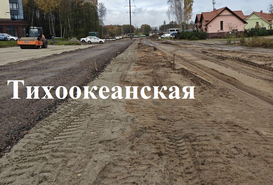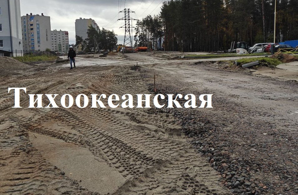 На строительстве Тихоокеанской в микрорайоне А. Космодемьянского ведут расчистку местности разрабатывают основание под проезжую часть и тротуары, отсыпают щебень и песок, прокладывают муниципальную кабельную канализацию.