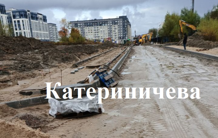 На Катериничева готовят основание, устанавливают бортовой камень.