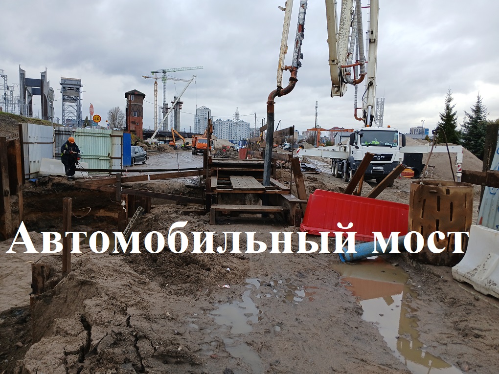 На будущем автомобильном мосту и прилегающей территории восстанавливают тротуары и дорогу после прокладки газопровода по ул. Савенко, в районе детской стоматологии; продолжают археологические работы; устраивают буронабивные сваи подпорной стены в районе детской стоматологии; извлекают шпунт по Железнодорожной и ведут обратную засыпку с уплотнением участков после прокладки напорной канализации от КНС-8; выполняют укрупнительную сборку металлоконструкций пролетного строения ПС1 на стапеле в пролете 3-4; устраивают стапель в пролете 4-5.