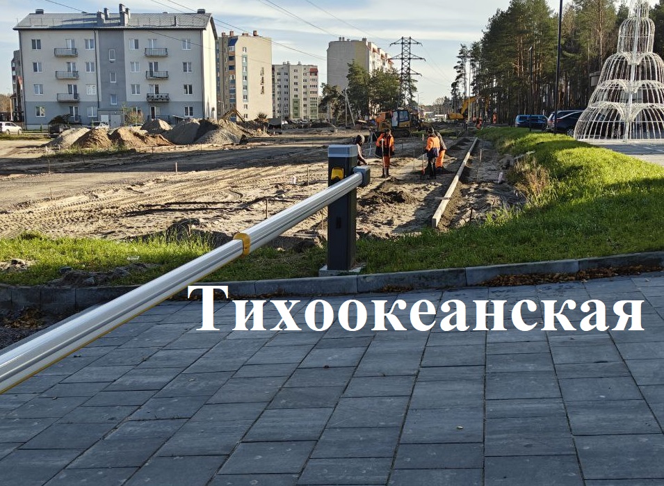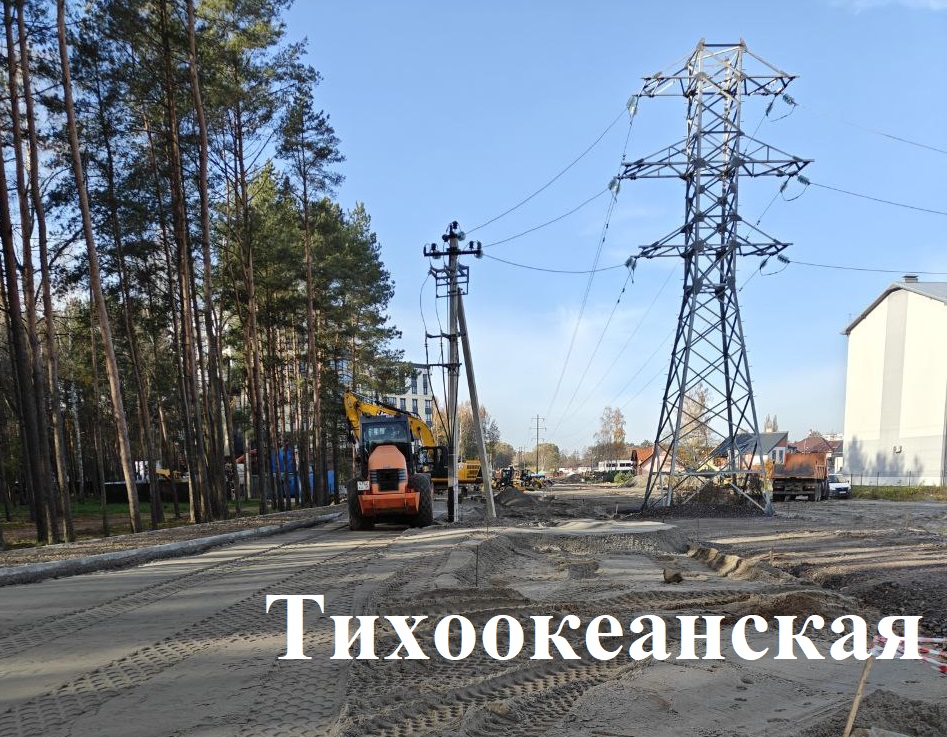 На соседней Тихоокеанской также устраивают основание проезжей части, тротуаров и велодорожки, начали установку опоры высоковольтной линии 15 кВ.