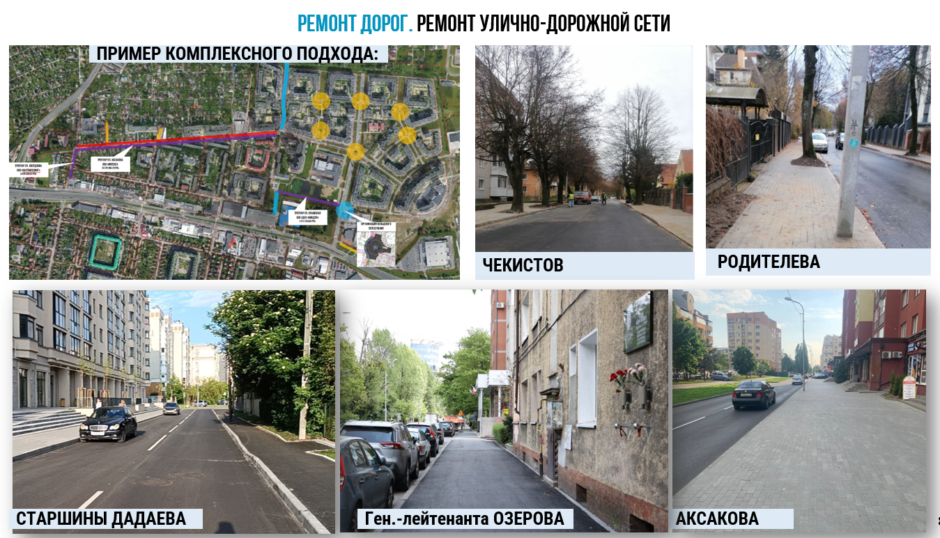 Еще одним примером комплексного подхода является реализация мероприятий по ремонту и содержанию улично-дорожной сети микрорайона ул. Аксакова. Скоординированы работы по ремонту проезжей части, обустройству тротуаров, строительству тротуаров и замощению «народных троп».