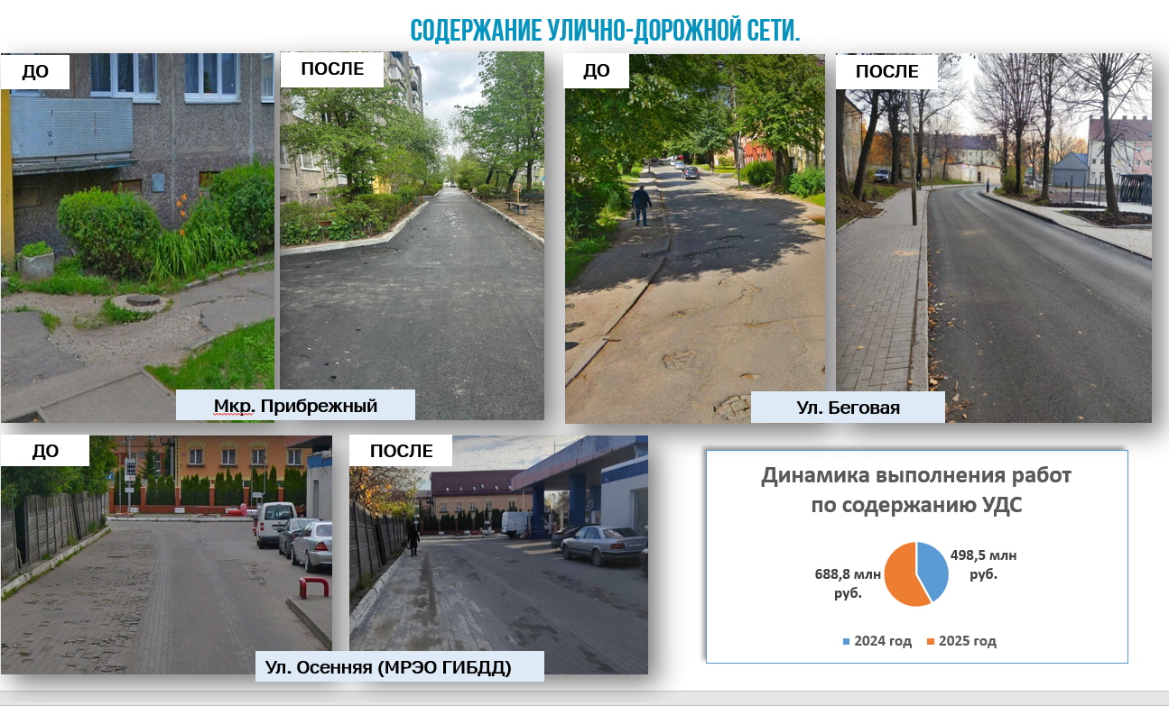 В 2025 году объёмы финансирования по ремонту улично-дорожной сети были сохранены, при этом качественно увеличены в отношении программы ремонта тротуаров и капитального ремонта дорог. Итогом запланировано выполнение объёма работ: