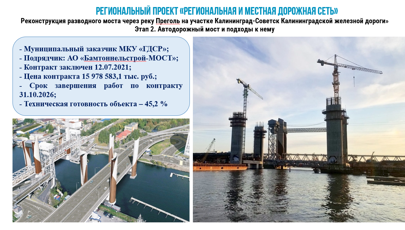 В рамках первого мероприятия реализуется объект «Реконструкция разводного моста через реку Преголя на участке Калининград-Советск Калининградской железной дороги». Протяженность этого самого масштабного объекта – 2,22 км, готовность объекта 45,2 процента. В соответствии с дополнительным соглашением срок выполнения строительно-монтажных работ продлен до 31 октября 2026 года.