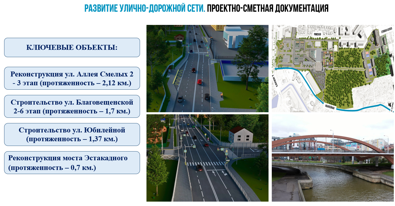 1.Реконструкция ул. Аллея Смелых, 2-3 этап, от ул. Н. Карамзина до железнодорожного путепровода (протяженность – 2,12 км.) – проходят экспертизу;