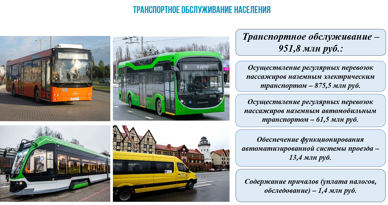 На реализацию транспортного обслуживания населения в 2025 году предусмотрено 951,8 млн руб.: осуществляются оплата по муниципальным контрактам перевозчикам за работы, связанные с осуществлением регулярных перевозок пассажиров и багажа автомобильным транспортом – 61,5 млн руб. и электрическим транспортом – 875,5 млн руб., обеспечение функционирования автоматической системы учета оплаты проезда (АСУОП) – 13,4 млн руб., содержание причалов – 1,4 млн руб.